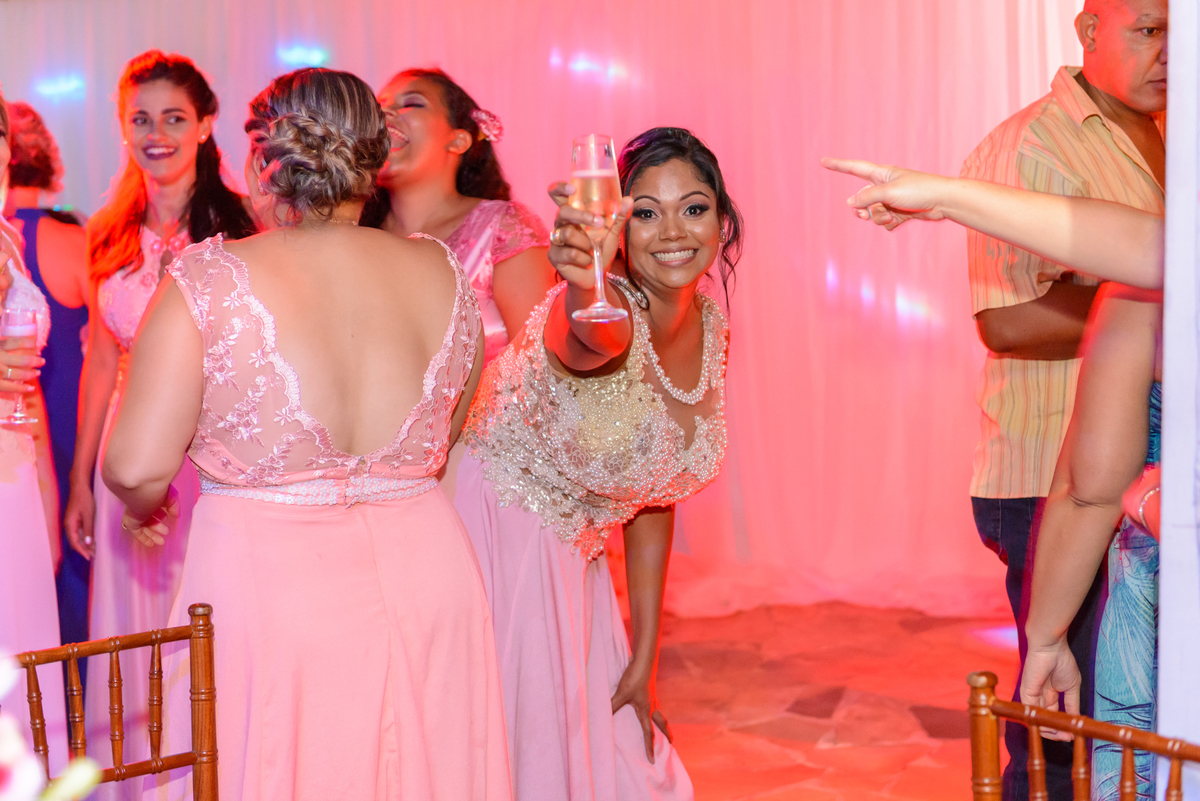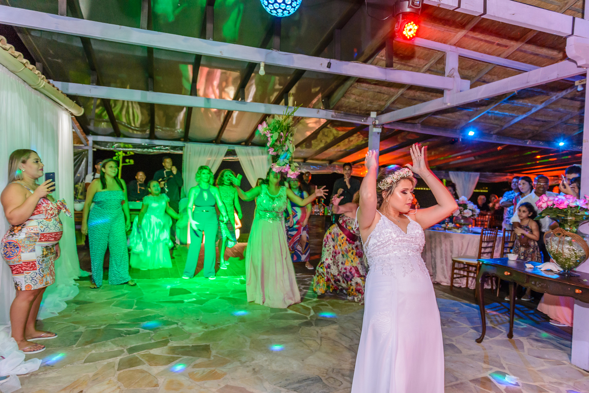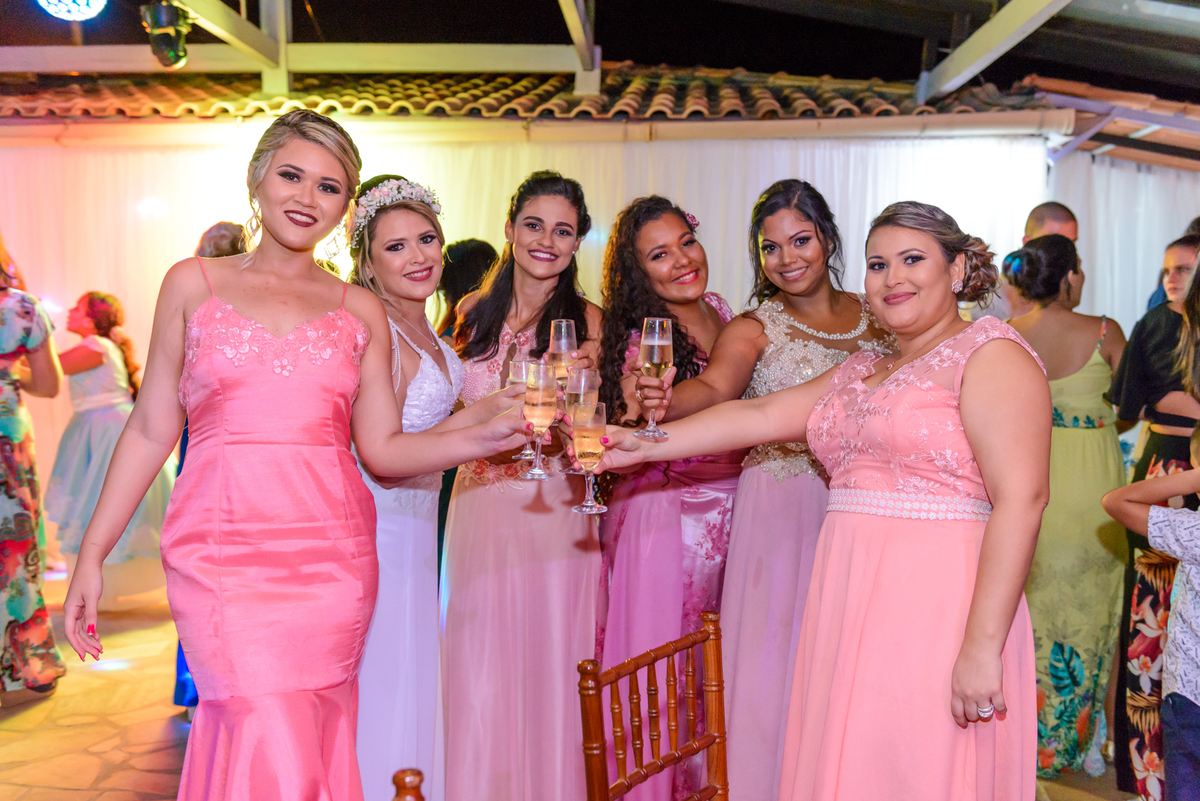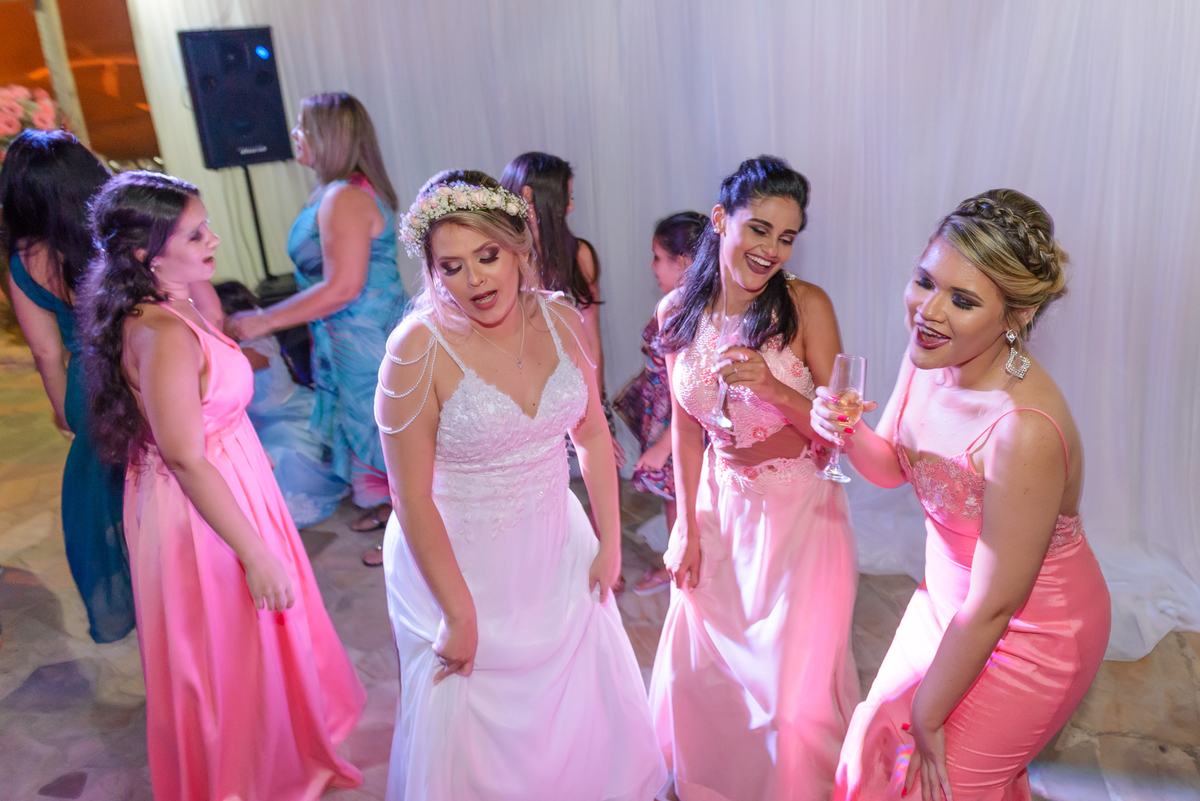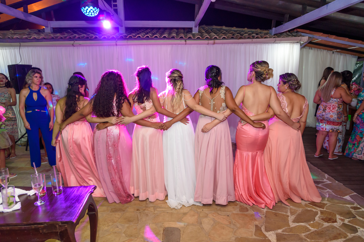 Madrinhas puxam o vestido da noiva em casamento no quiosque harmonia, Niterói - RJ