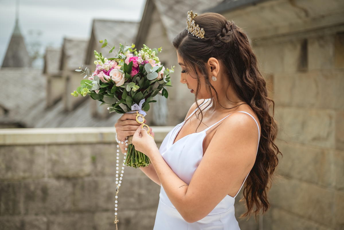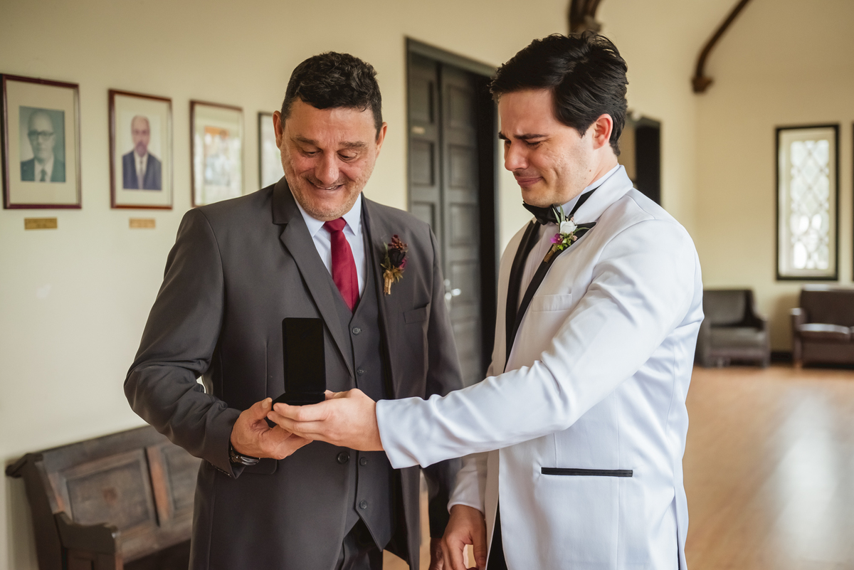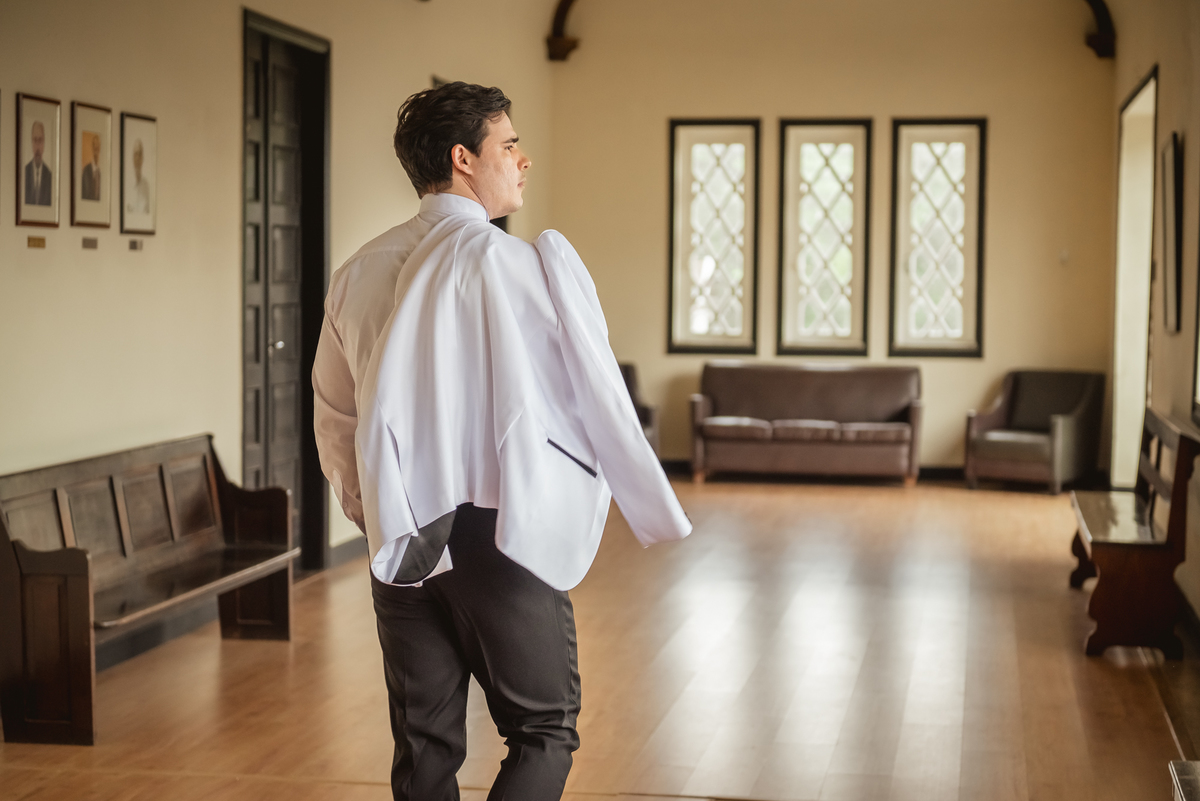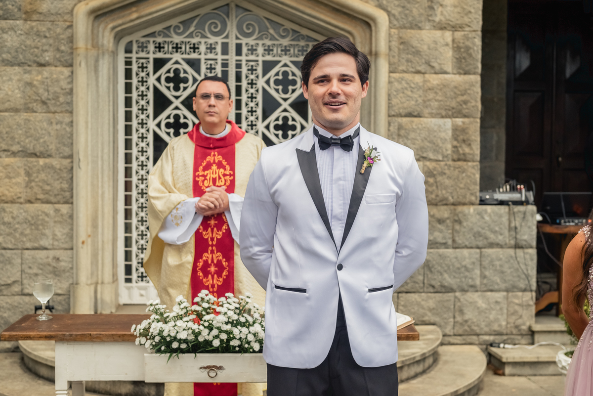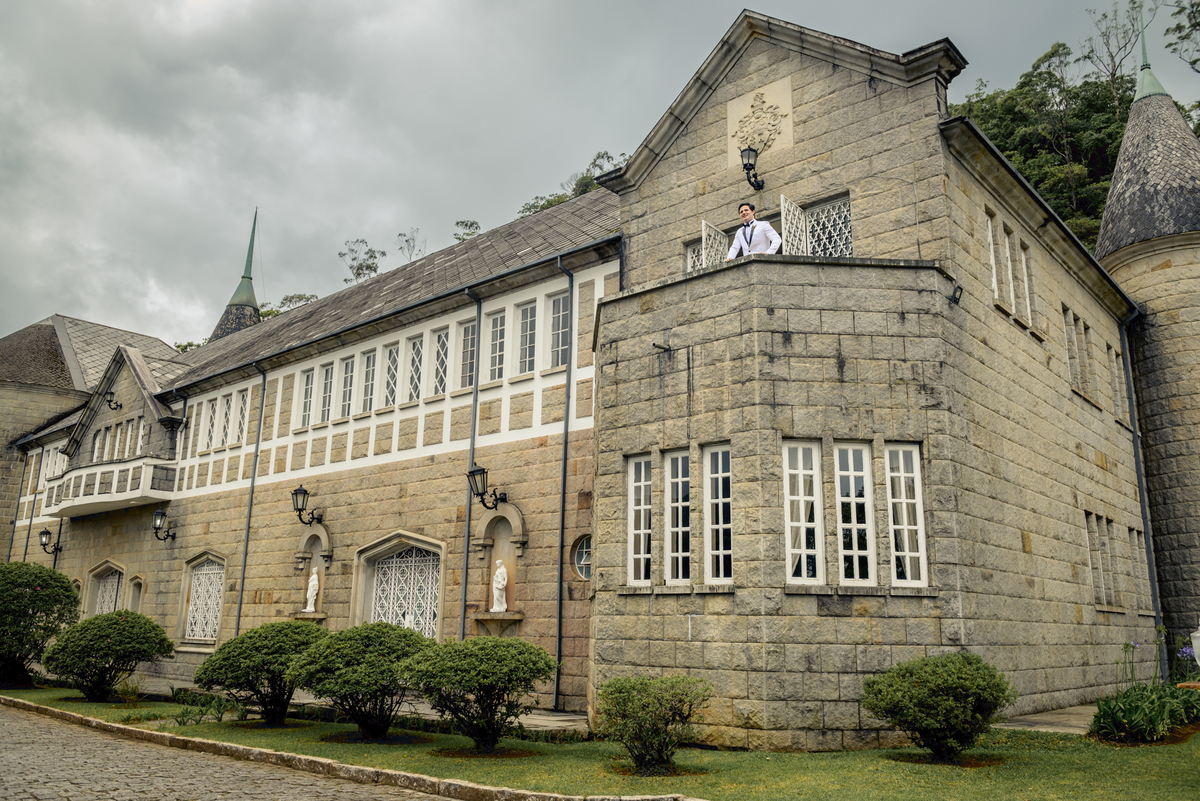 Ainda tivemos tempo de fotografar o noivo Caio pelos corredores do castelo e também na sacada enquanto a Paola colocava o seu vestido para o grande momento. Nesse momento também tivemos uma surpresa para o noivo que se emocionou com a recordação de entes queridos.