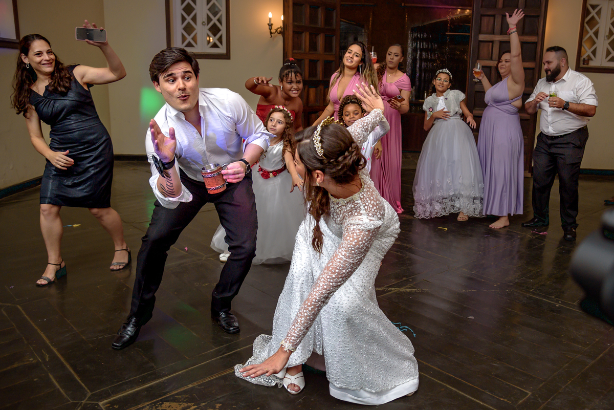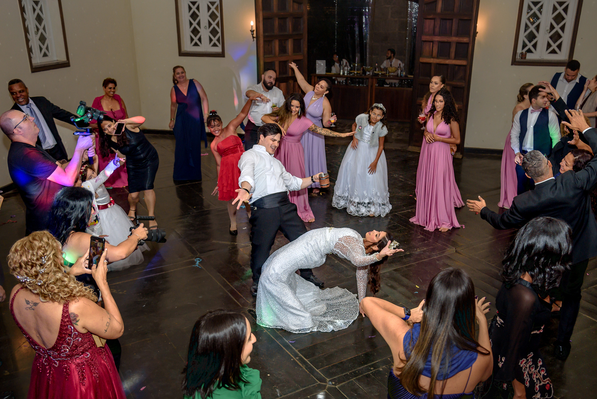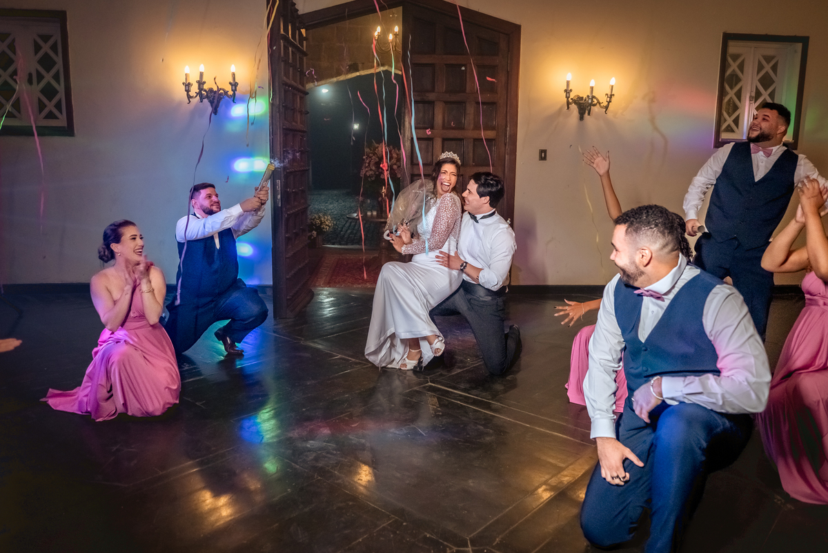 Depois da cerimônia fomos aos corredores e fizemos algumas fotos somente com o casal e a Paola parou na capelinha do castelo para rezar e agradecer pelo seu casamento. Depois fomos fazer as fotos protocolares na mesa do bolo com o pajem e daminhas, pais do noivo e da noiva e algumas brincadeiras com os padrinhos. Houve uma pequena pausa para a alimentação do casal, mas logo eles desceram para fazer a primeira dança e abrir a pista.