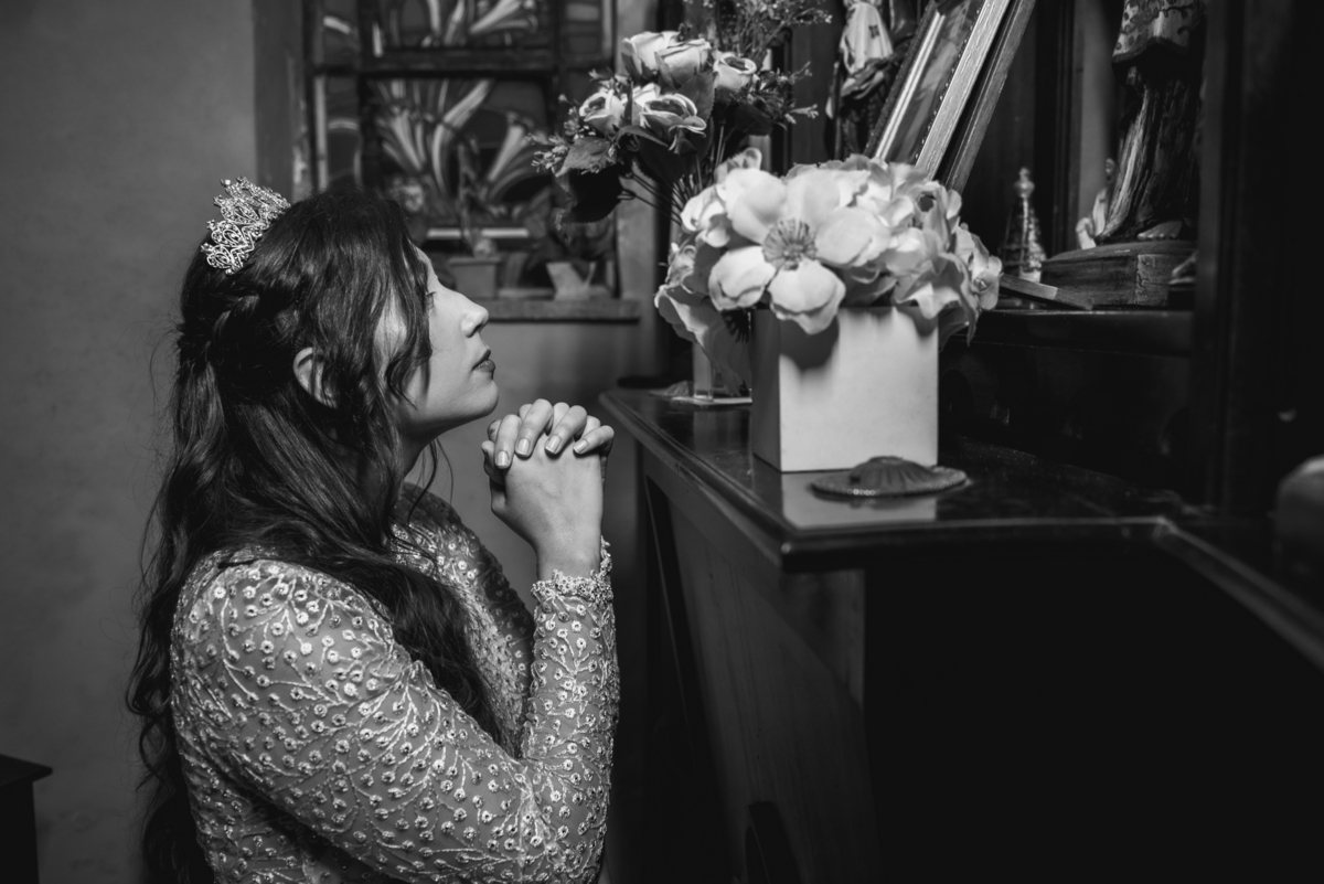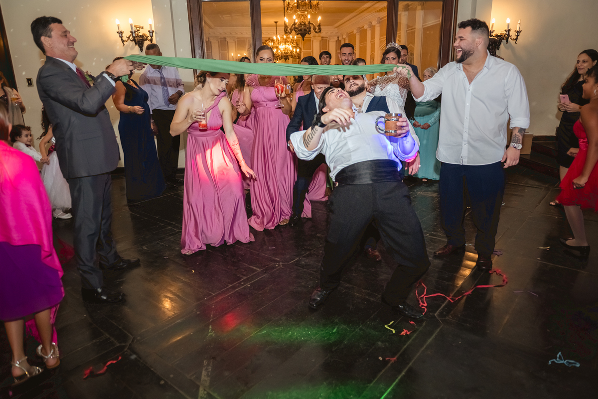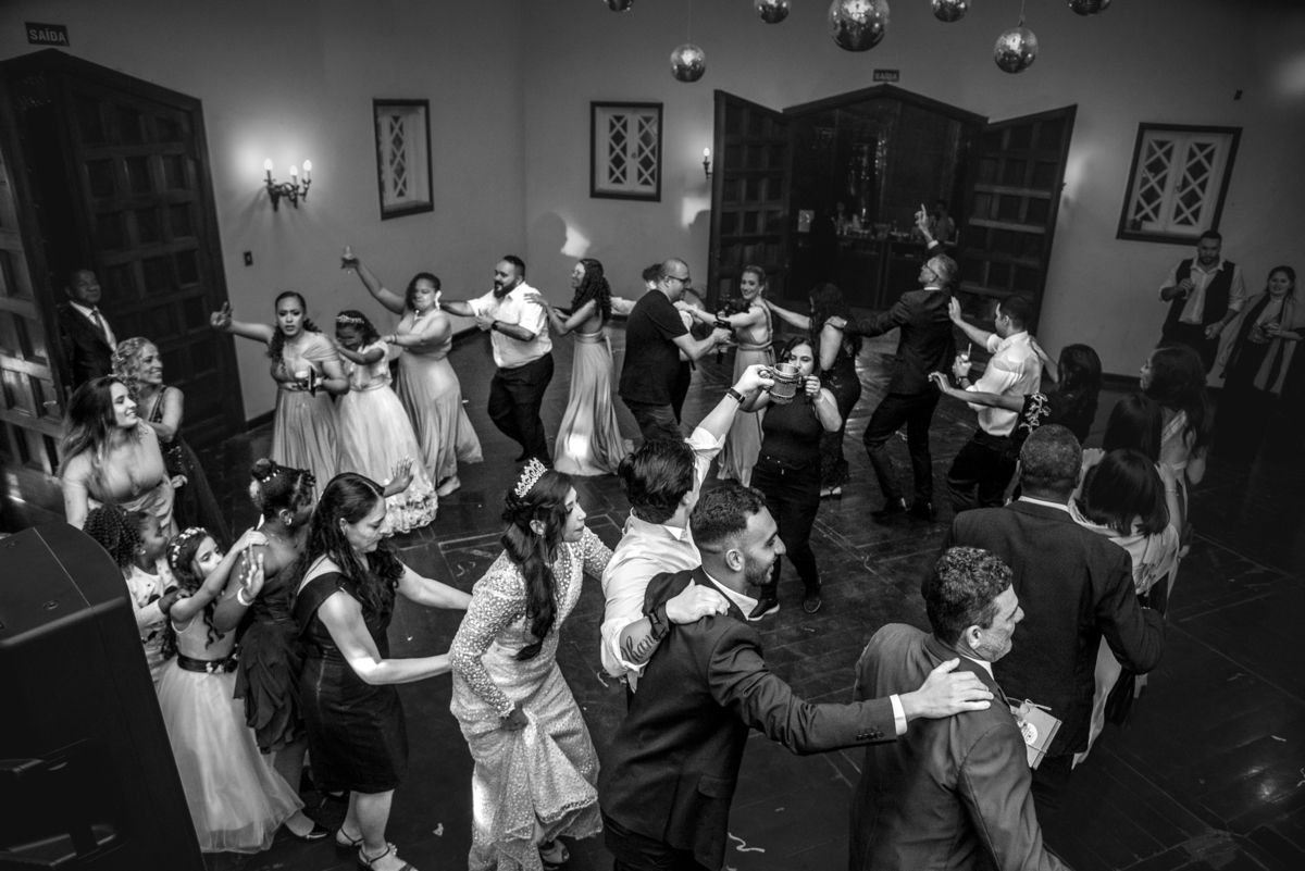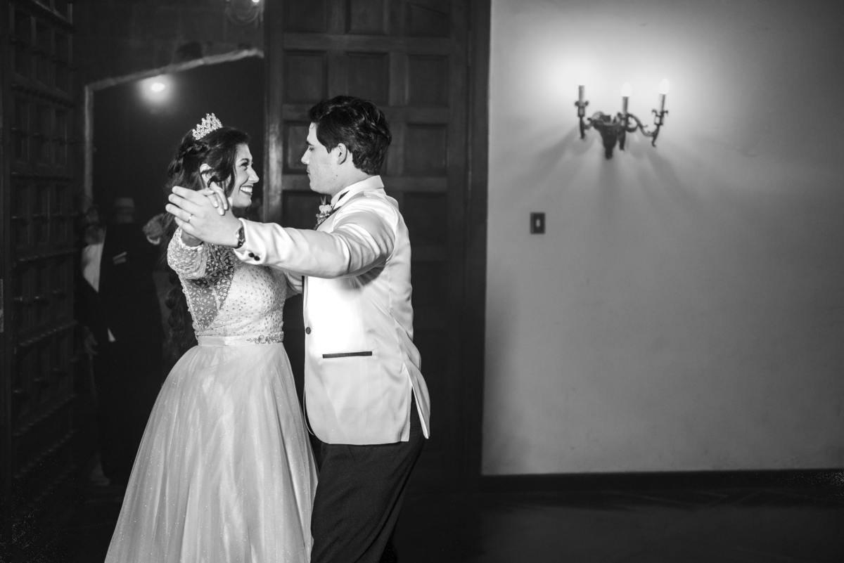 Depois da cerimônia fomos aos corredores e fizemos algumas fotos somente com o casal e a Paola parou na capelinha do castelo para rezar e agradecer pelo seu casamento. Depois fomos fazer as fotos protocolares na mesa do bolo com o pajem e daminhas, pais do noivo e da noiva e algumas brincadeiras com os padrinhos. Houve uma pequena pausa para a alimentação do casal, mas logo eles desceram para fazer a primeira dança e abrir a pista.