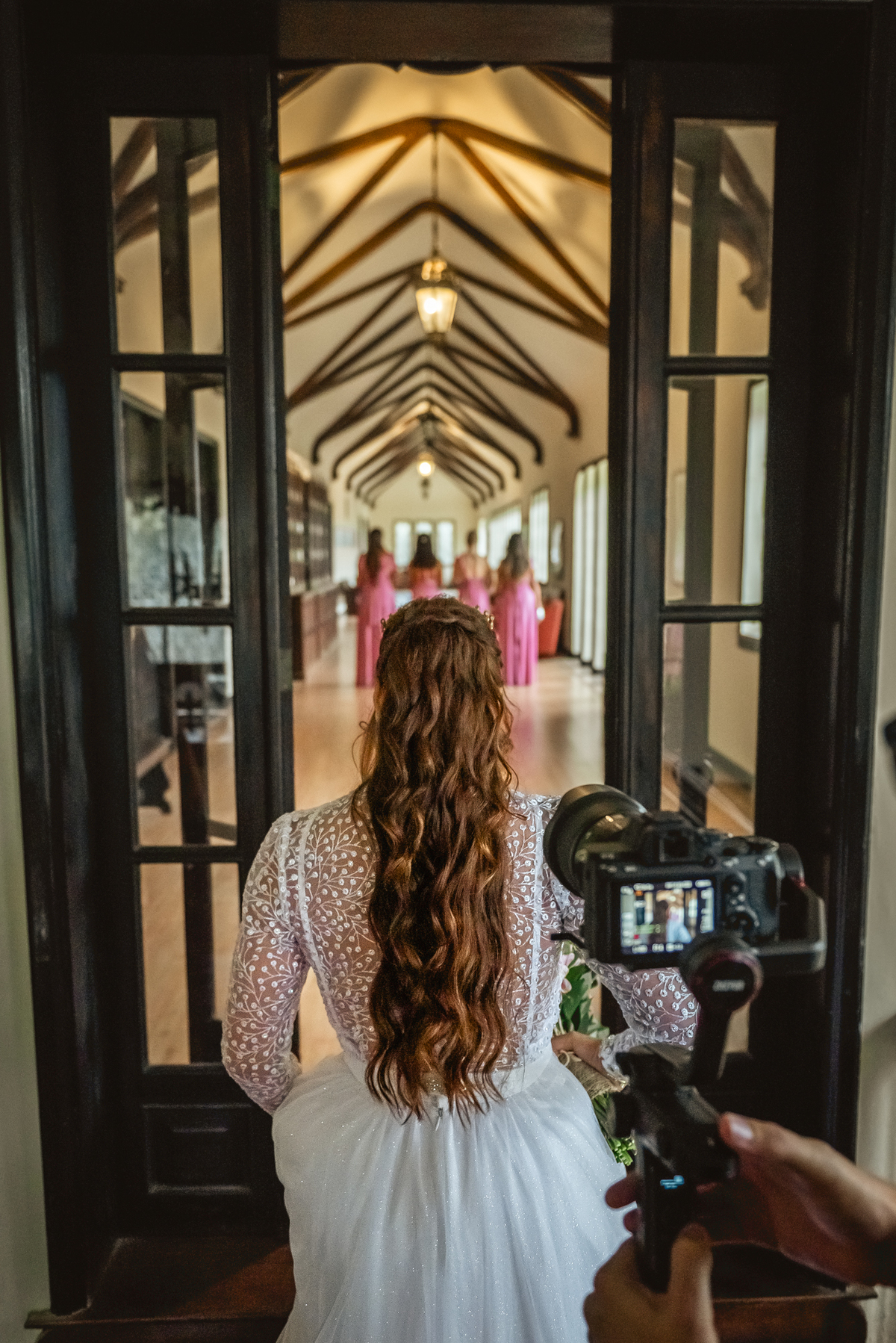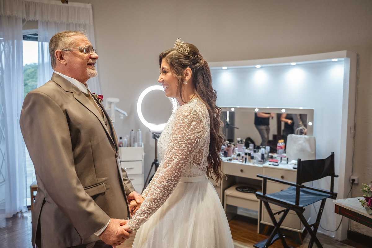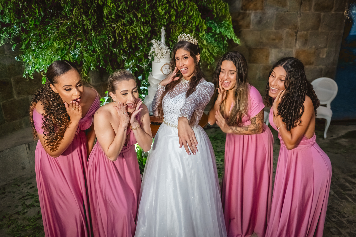 Depois de pronta, fotografamos a noiva em outro pátio no alto do castelo e depois fomos ao encontro das madrinhas que estavam ansiosas para ver a noiva pela primeira vez. O choque foi instantâneo quando viraram e viram a Paola lindamente vestida para o casamento. Assim como as madrinhas o pai também foi conferir como a filha estava linda e foi um momento intimo muito bonito.