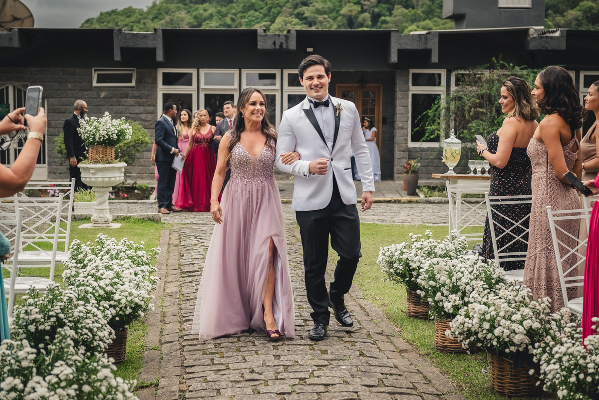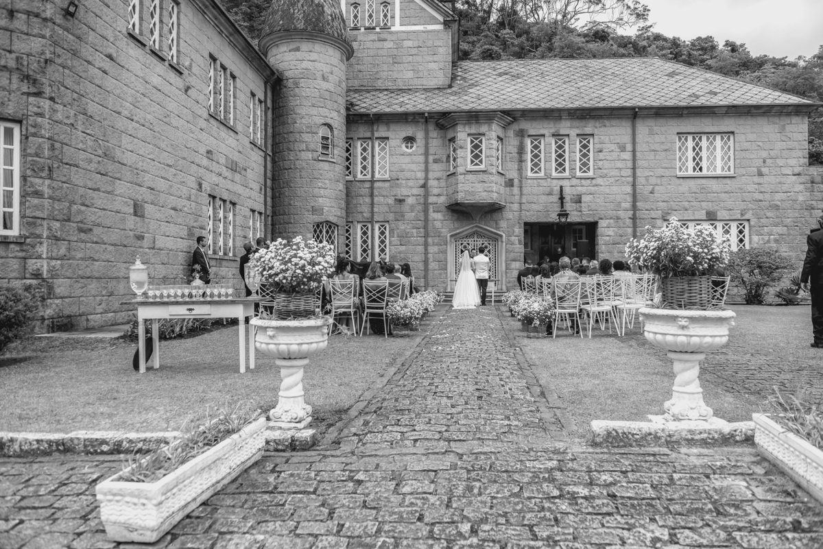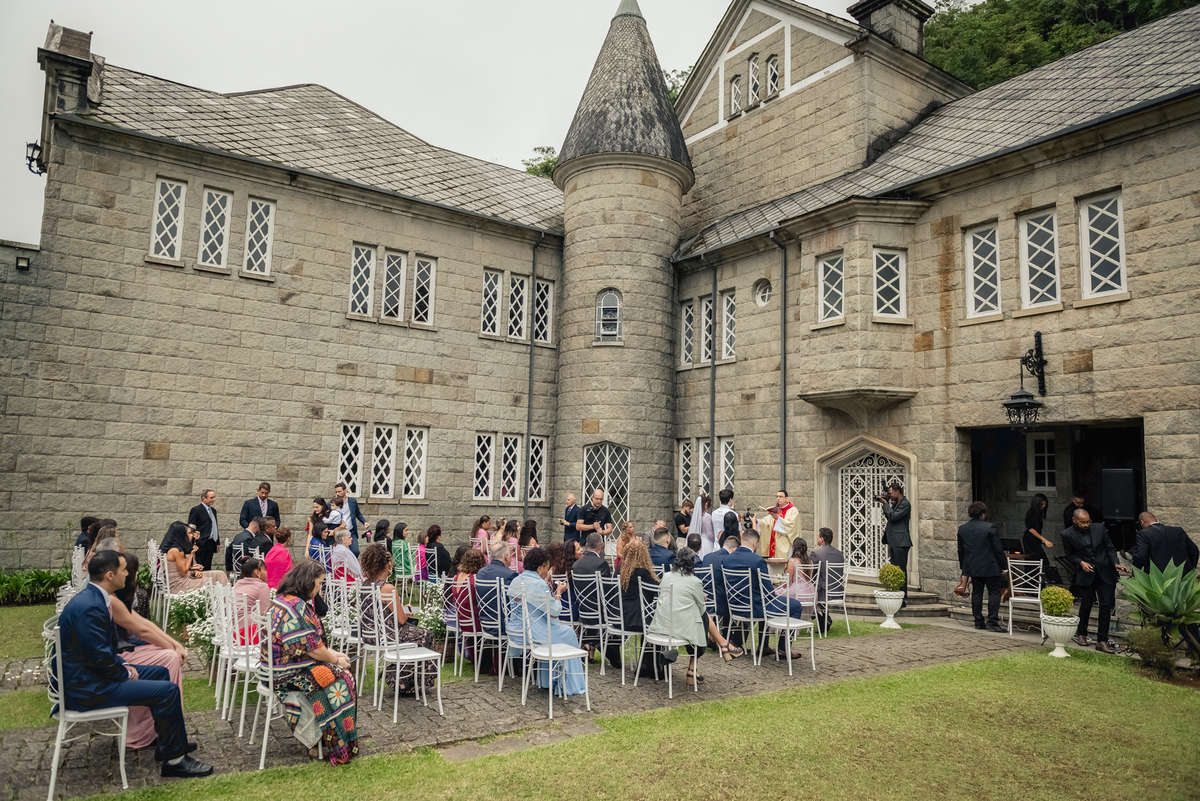 Já estava na hora da cerimônia e tudo estava montado no lindo jardim do castelo. Fizemos rapidamente as fotos da decoração e fomos aguardar a entrada do cortejo. Tudo estava perfeito. A entrada da florista foi mais um momento de emoção e um show a parte. Ela cantou uma musica para o Caio e ele também se emocionou.