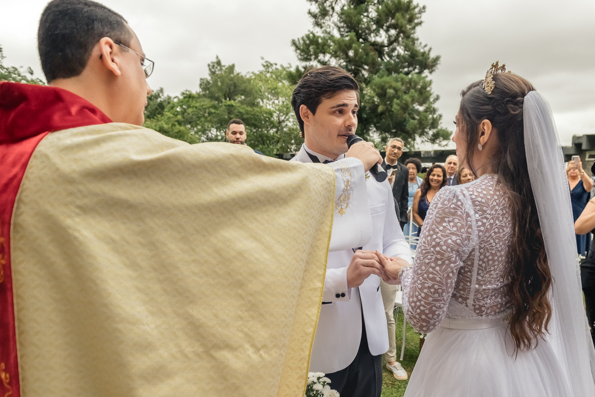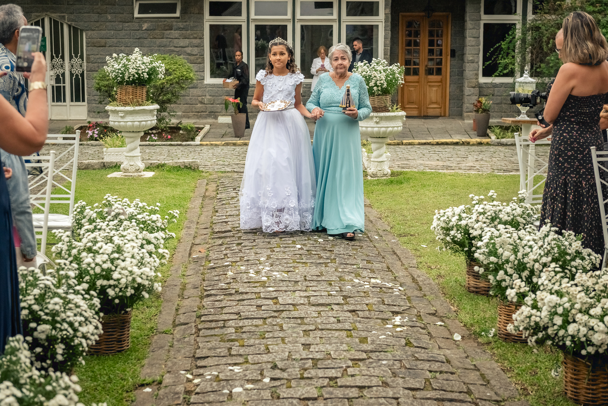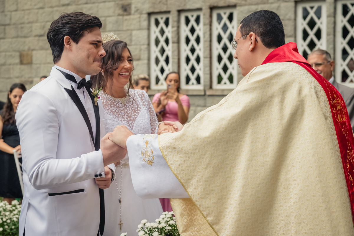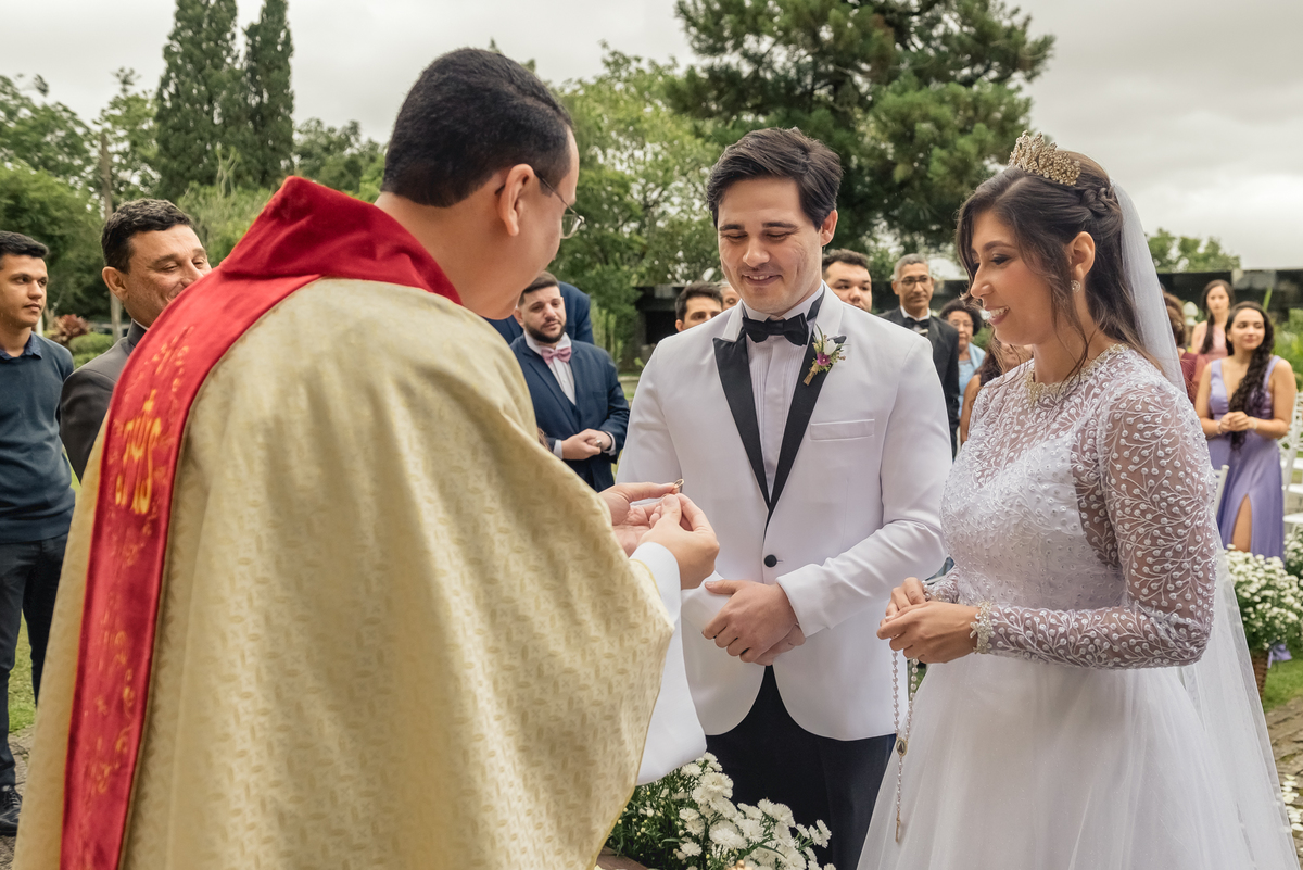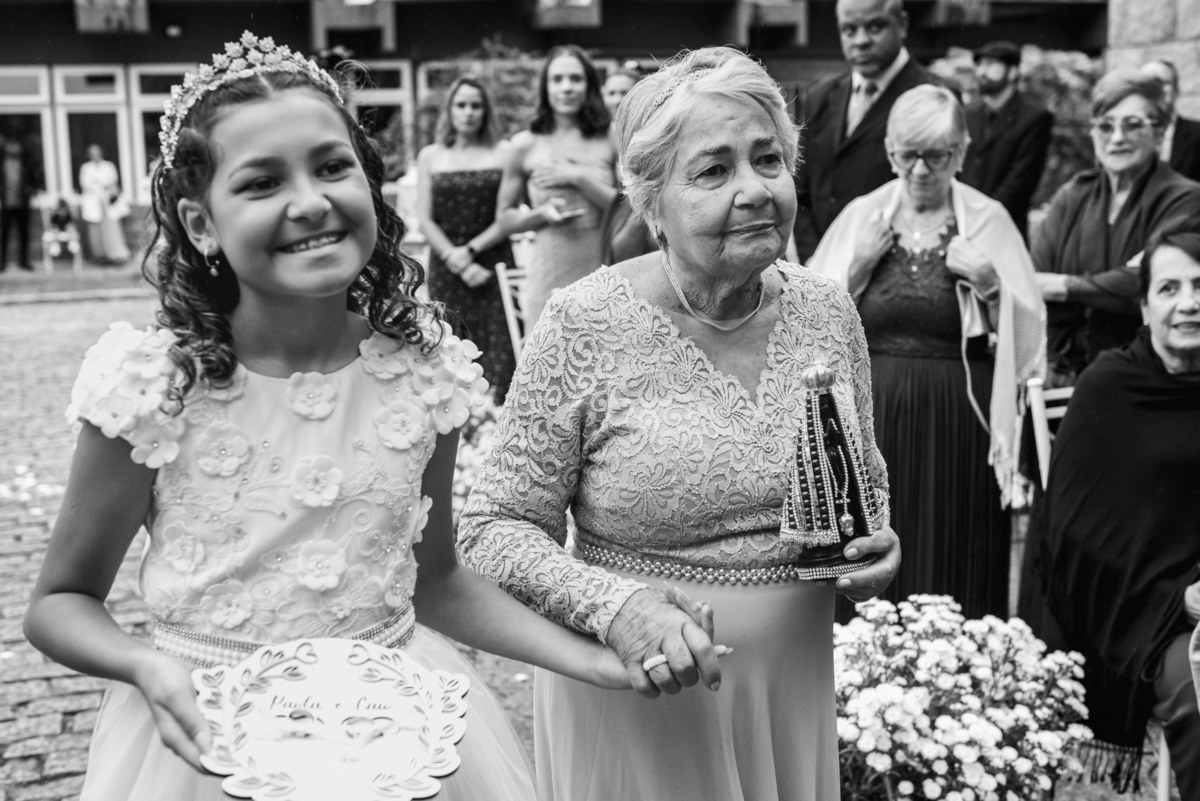 Chegada a hora, a Paola entrou com seu pai e a cerimônia foi iniciada pelo padre. Tiveram muitas lágrimas e risadas durante os depoimentos dos noivos, na entrada das alianças a avó da Paola acompanhou a daminha com uma imagem de nossa senhora.