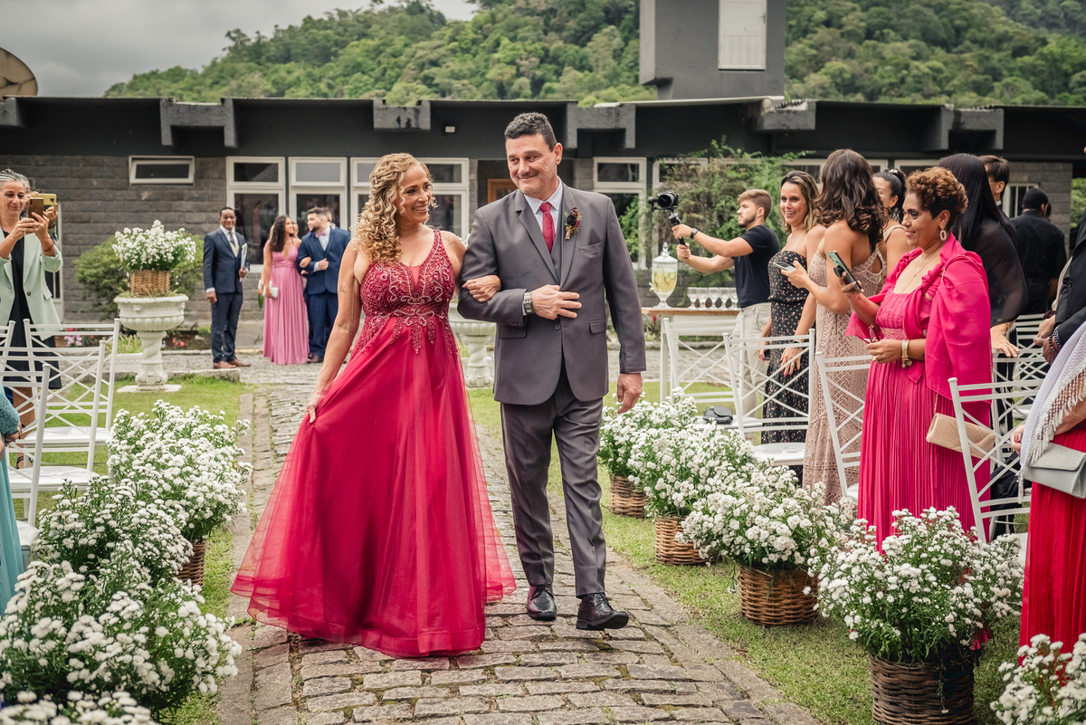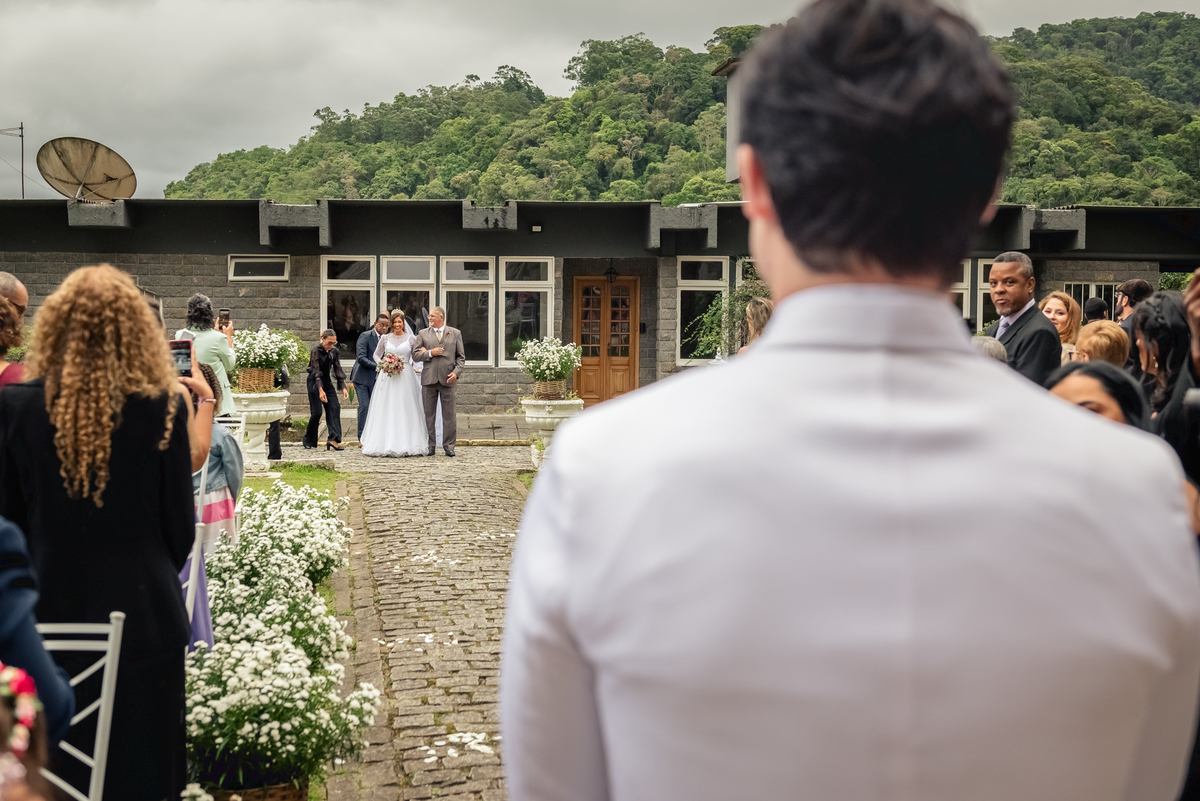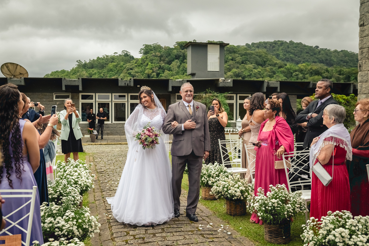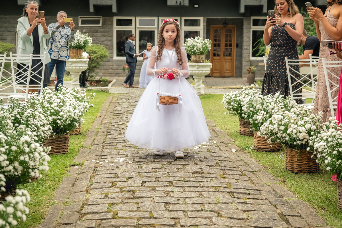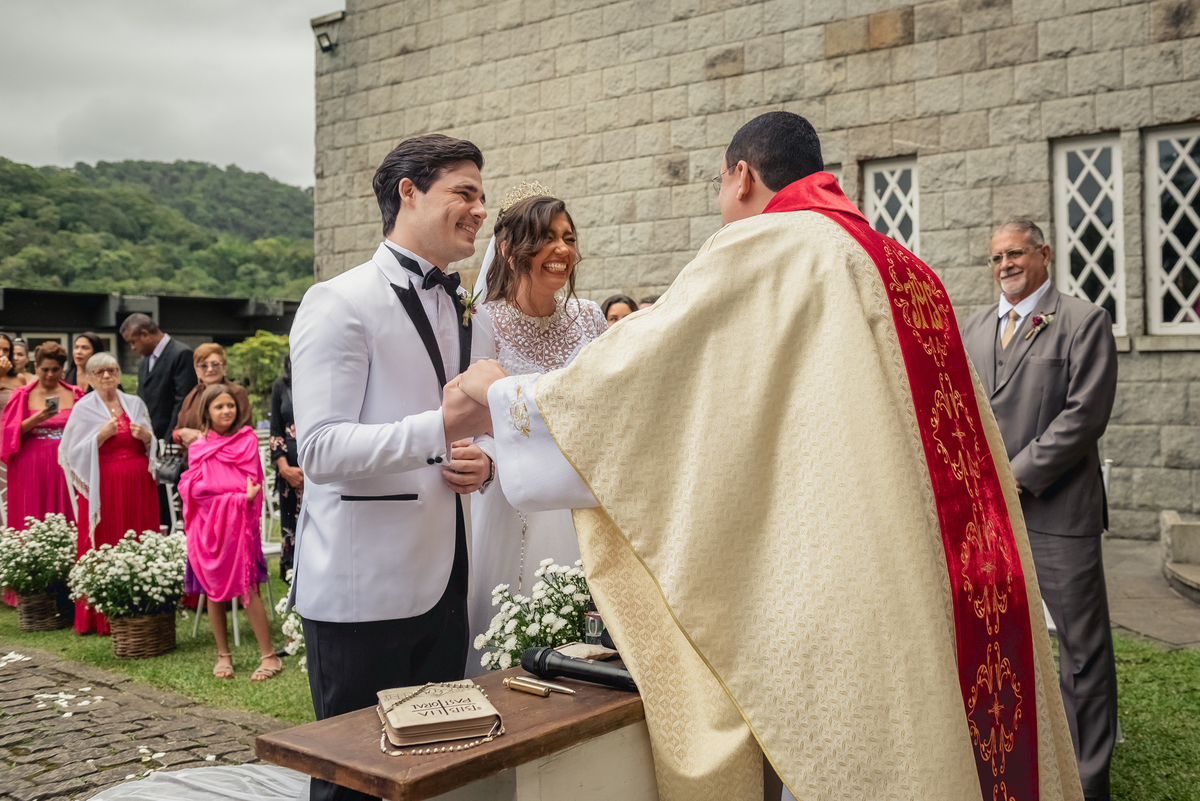 Chegada a hora, a Paola entrou com seu pai e a cerimônia foi iniciada pelo padre. Tiveram muitas lágrimas e risadas durante os depoimentos dos noivos, na entrada das alianças a avó da Paola acompanhou a daminha com uma imagem de nossa senhora.