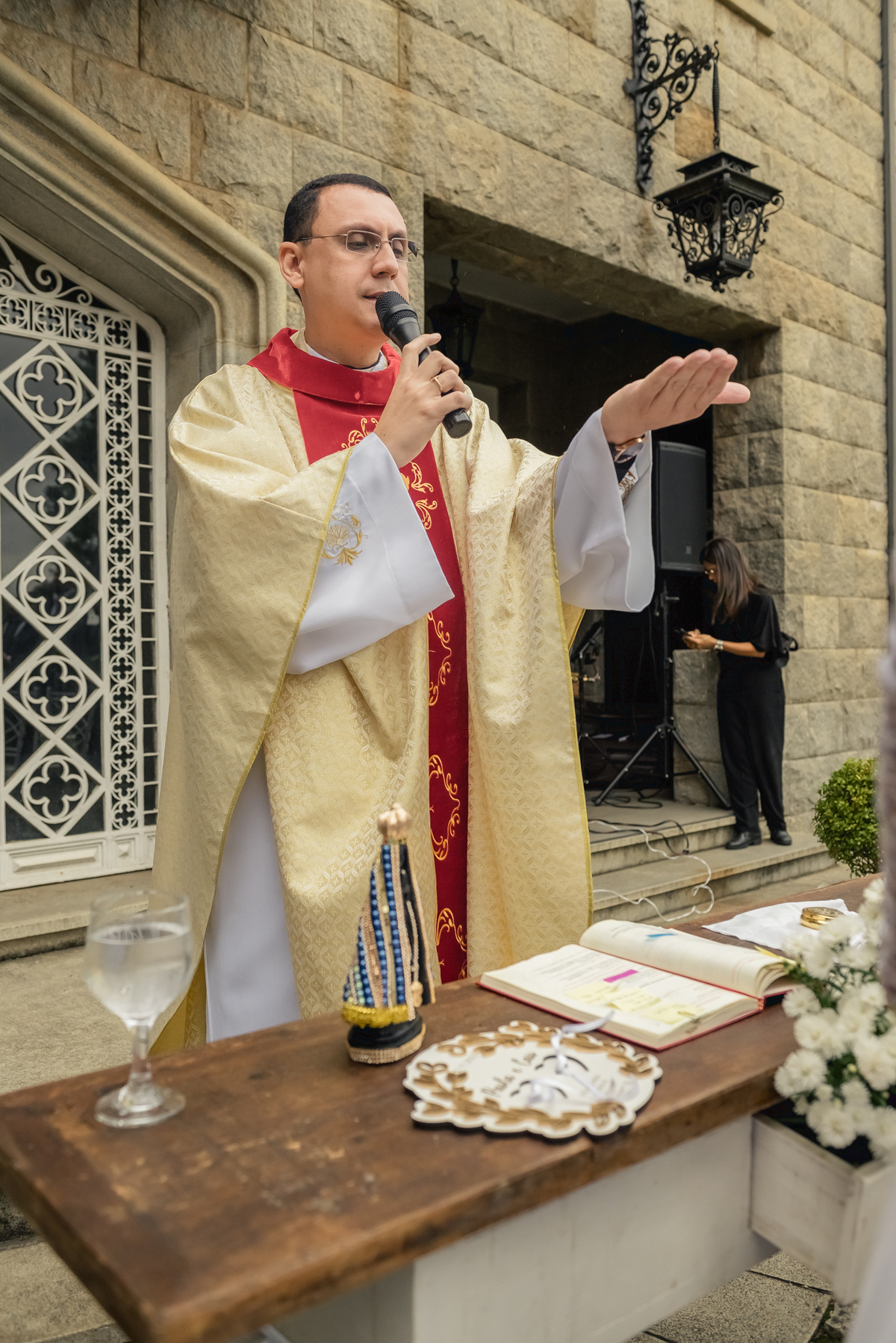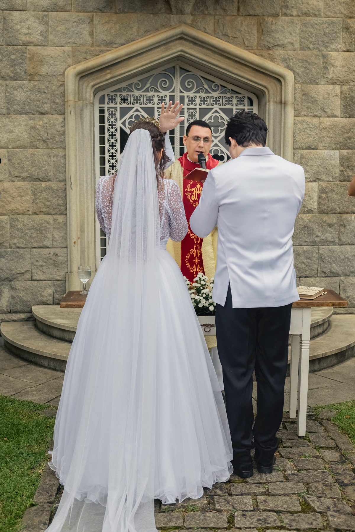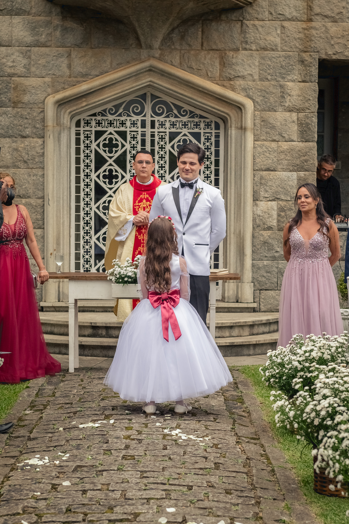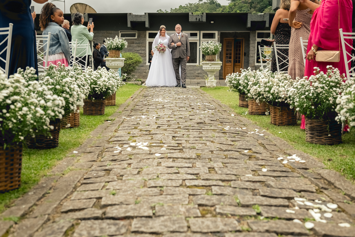 Chegada a hora, a Paola entrou com seu pai e a cerimônia foi iniciada pelo padre. Tiveram muitas lágrimas e risadas durante os depoimentos dos noivos, na entrada das alianças a avó da Paola acompanhou a daminha com uma imagem de nossa senhora.