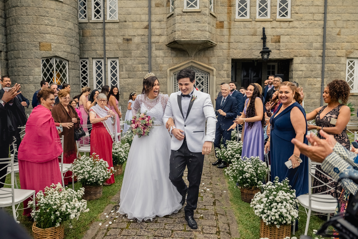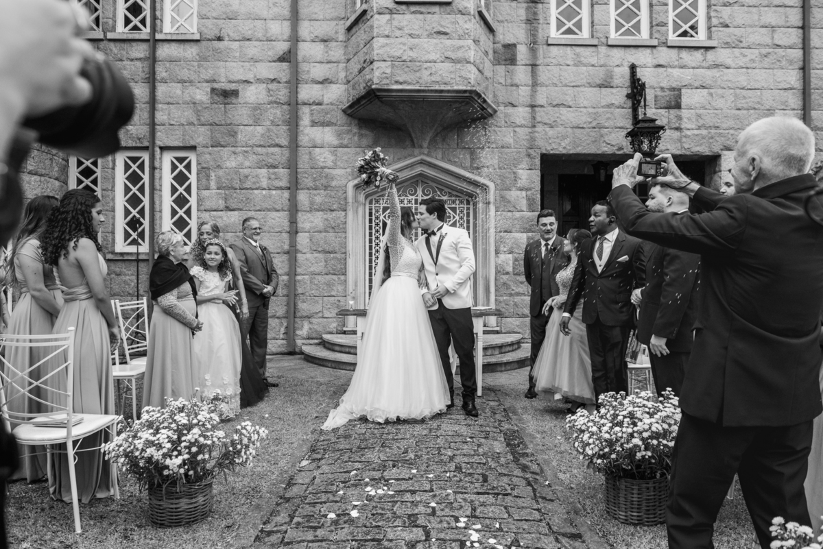 A chuva começou, mas veio bem fraquinha, como que batizando o casal e os abençoando junto com o padre. Na saída teve muita chuva, mas de arroz para dar muita sorte ao casal e a essa nova família que se inicia.