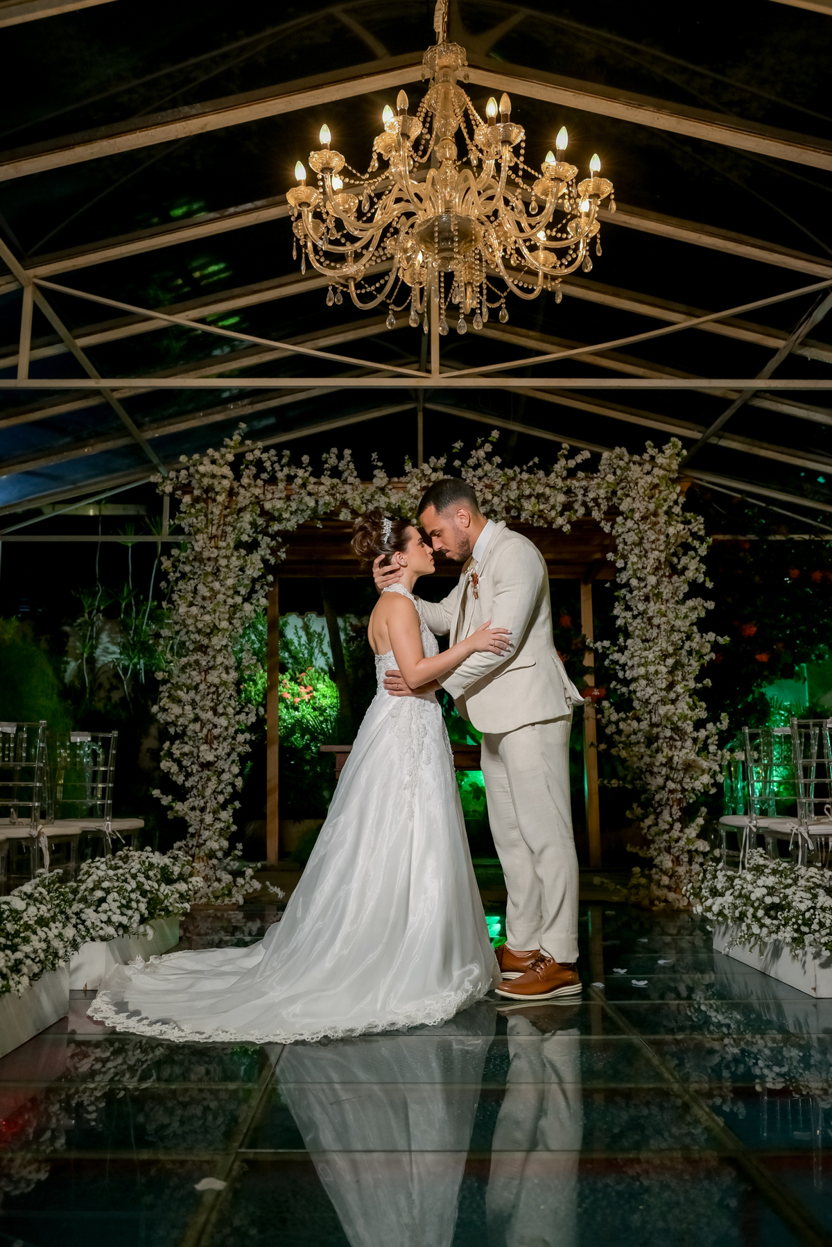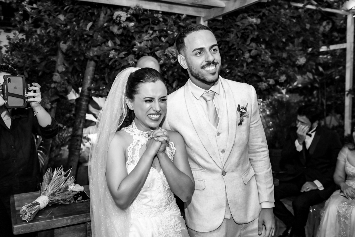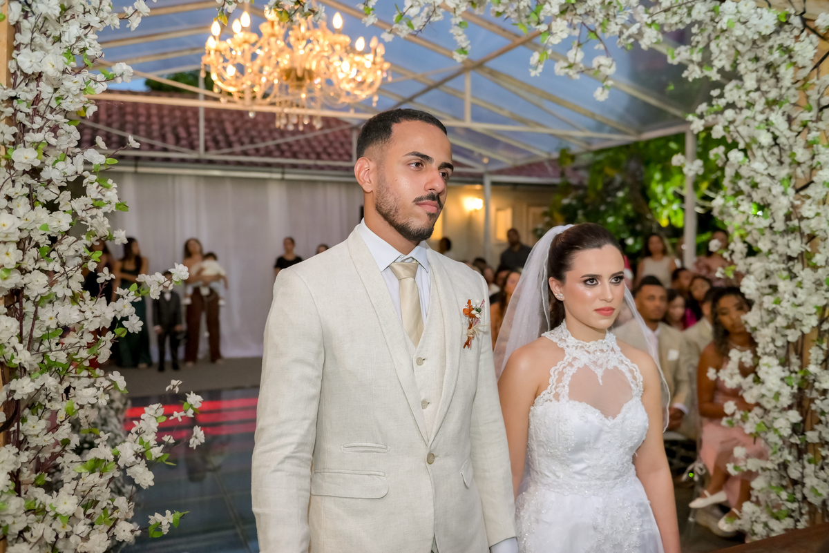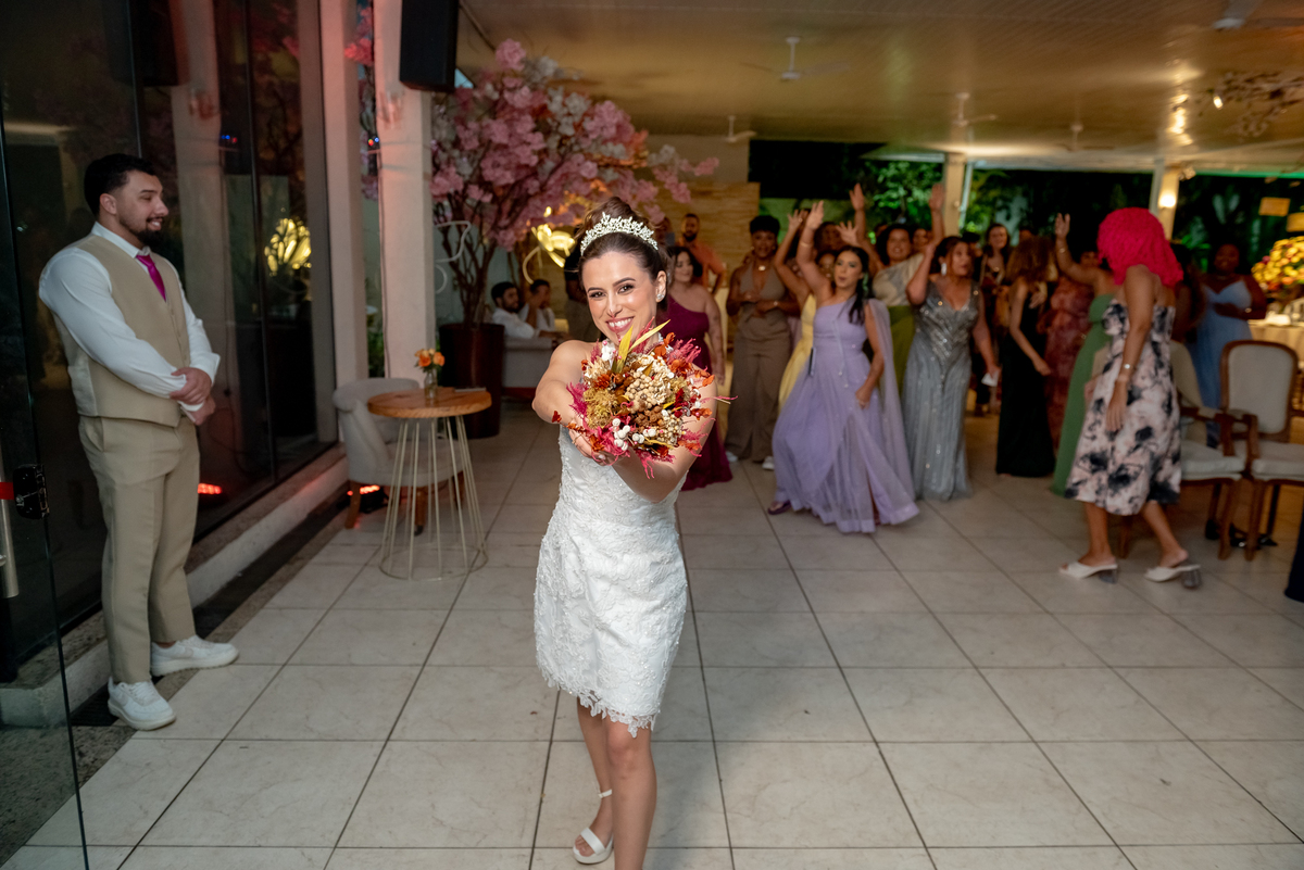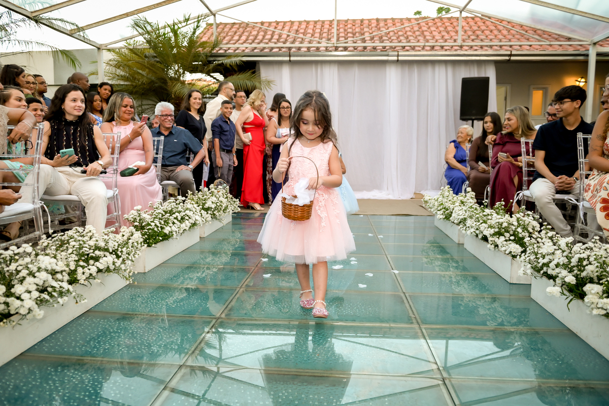A decoração do salão estava impecável e fizemos lindas fotos com a noiva, tanto no jardim do salão quanto no camarim. Teve também o momento do first view das madrinhas que se emocionaram ao ver a noiva com o vestido pela primeira vez. Durante a cerimônia teve um momento muito especial com a entrada da avó da noiva trazendo as alianças. Houve muita emoção durante os votos e a troca de alianças. A saída do casal também merece destaque.