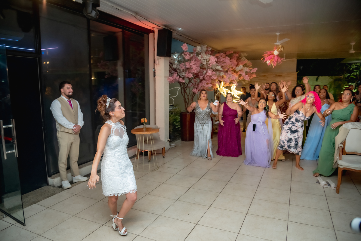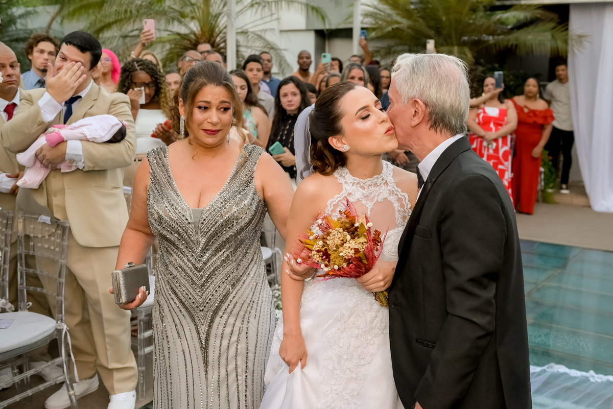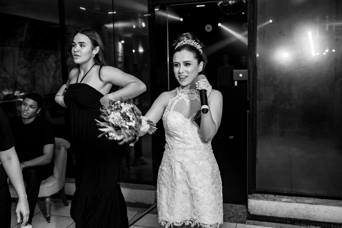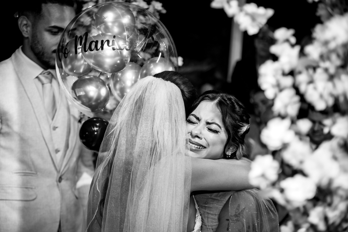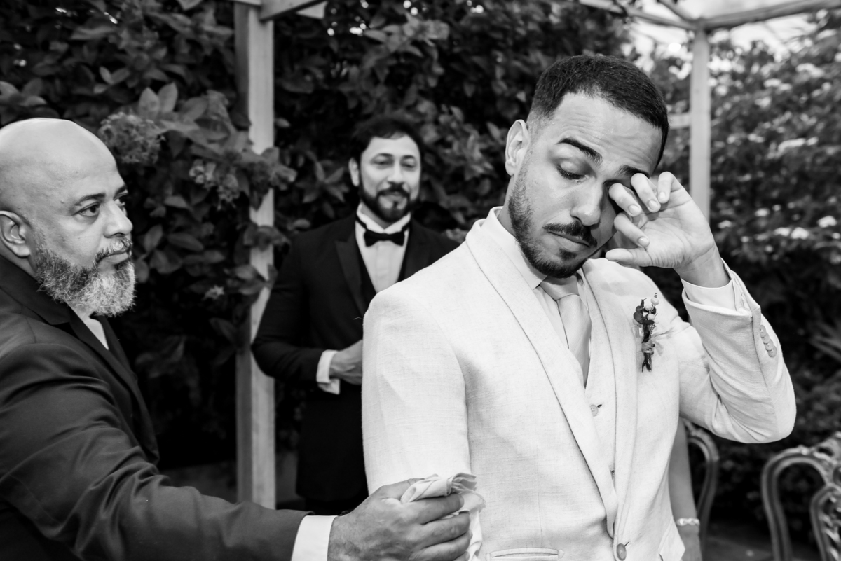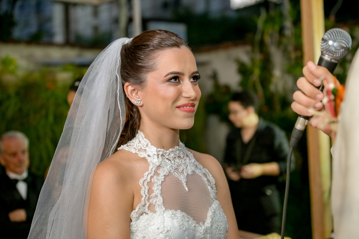 A decoração do salão estava impecável e fizemos lindas fotos com a noiva, tanto no jardim do salão quanto no camarim. Teve também o momento do first view das madrinhas que se emocionaram ao ver a noiva com o vestido pela primeira vez. Durante a cerimônia teve um momento muito especial com a entrada da avó da noiva trazendo as alianças. Houve muita emoção durante os votos e a troca de alianças. A saída do casal também merece destaque.