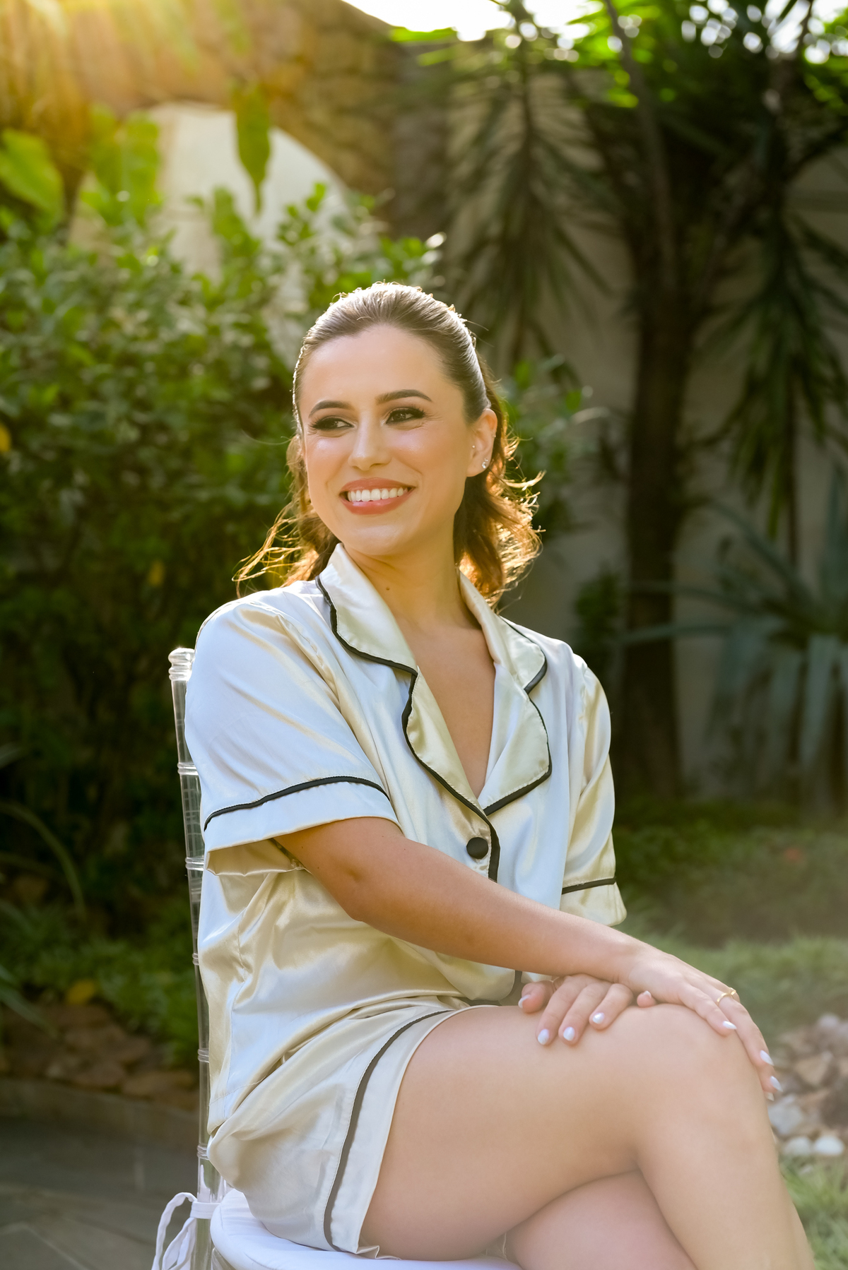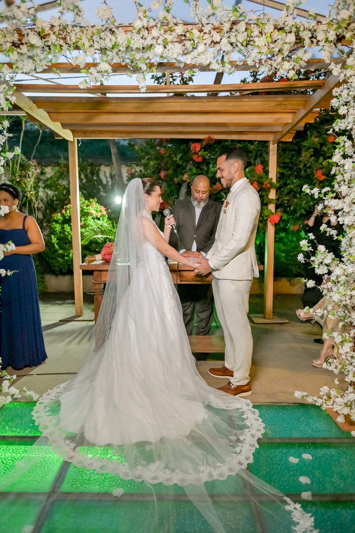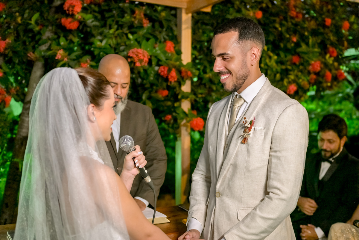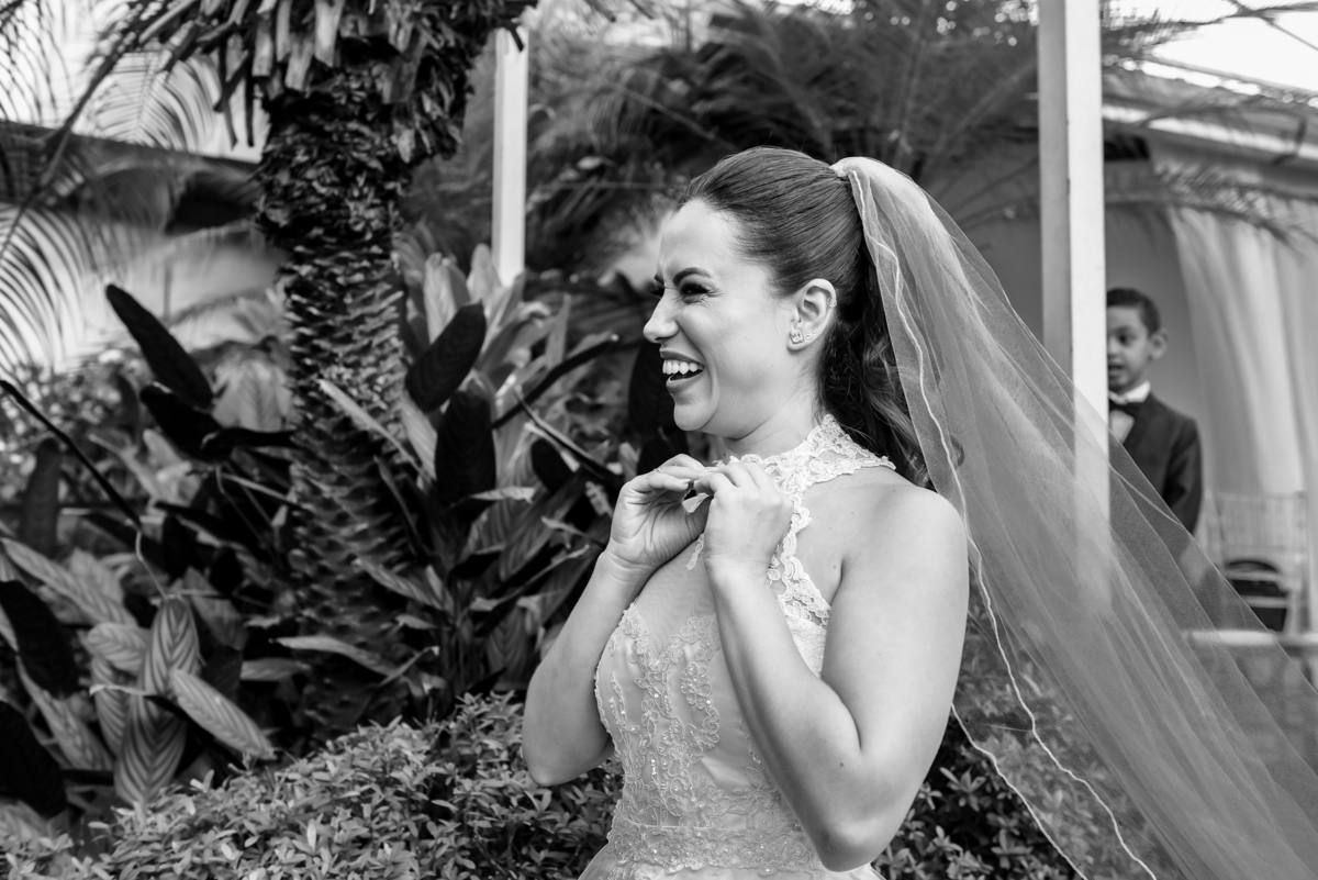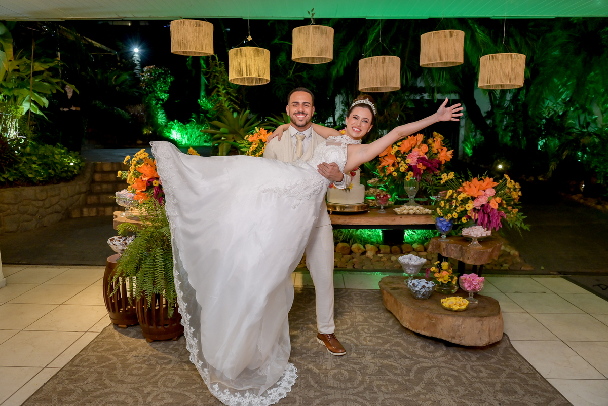 A decoração do salão estava impecável e fizemos lindas fotos com a noiva, tanto no jardim do salão quanto no camarim. Teve também o momento do first view das madrinhas que se emocionaram ao ver a noiva com o vestido pela primeira vez. Durante a cerimônia teve um momento muito especial com a entrada da avó da noiva trazendo as alianças. Houve muita emoção durante os votos e a troca de alianças. A saída do casal também merece destaque.