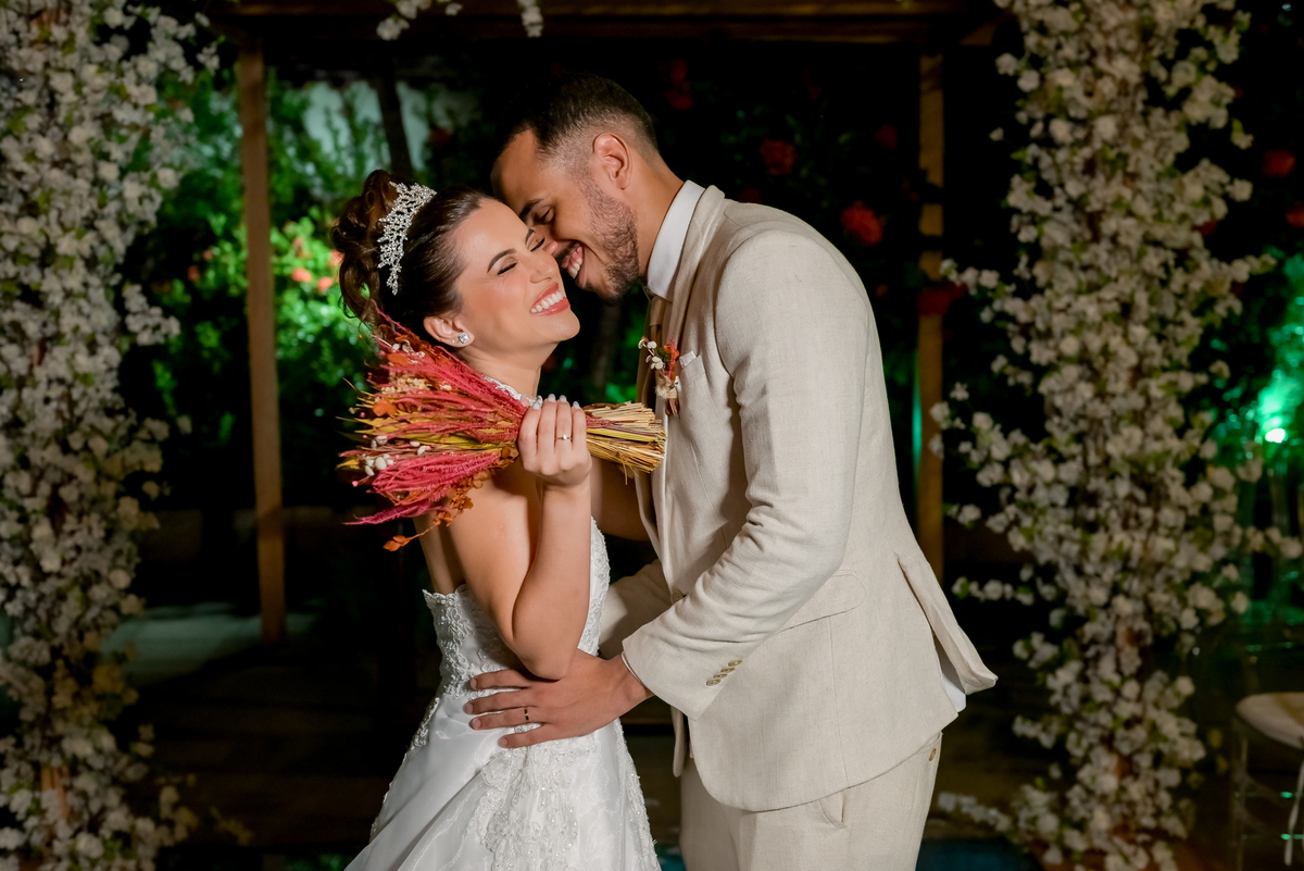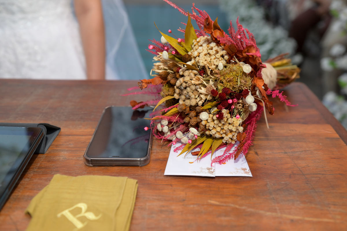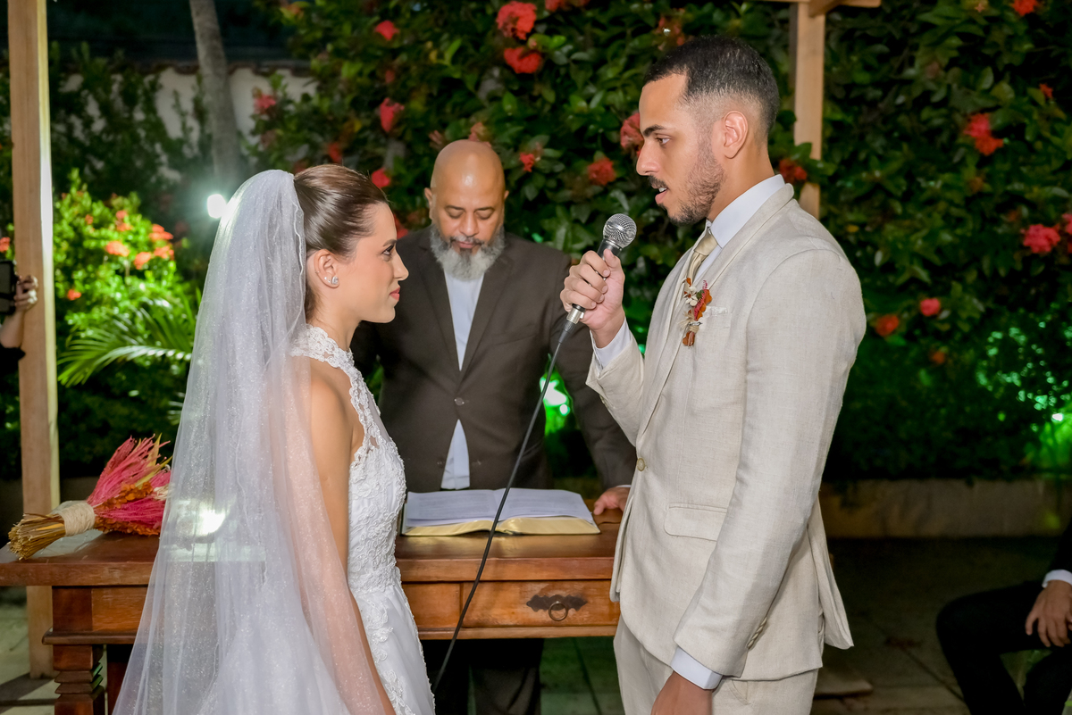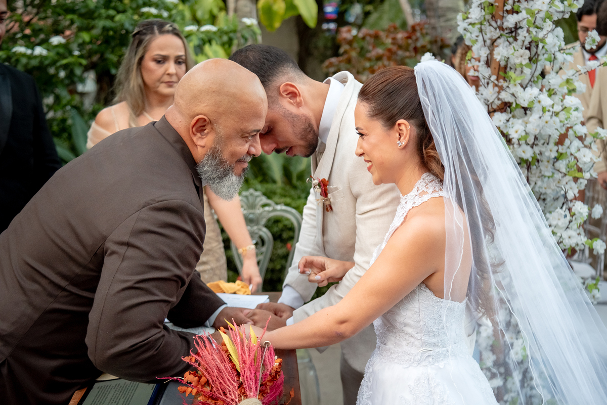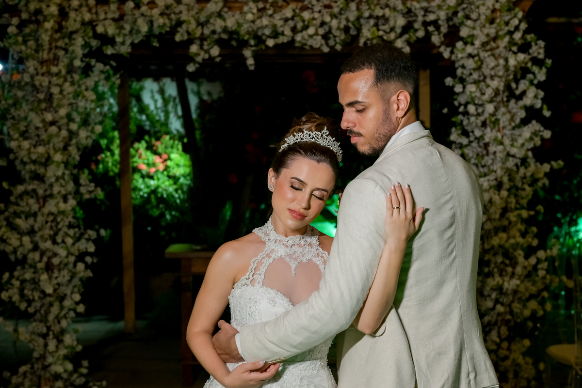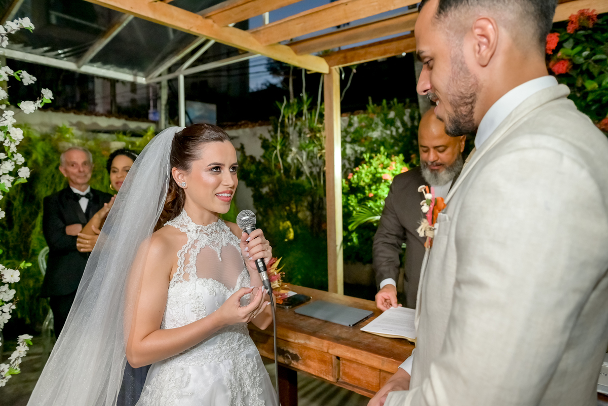 A decoração do salão estava impecável e fizemos lindas fotos com a noiva, tanto no jardim do salão quanto no camarim. Teve também o momento do first view das madrinhas que se emocionaram ao ver a noiva com o vestido pela primeira vez. Durante a cerimônia teve um momento muito especial com a entrada da avó da noiva trazendo as alianças. Houve muita emoção durante os votos e a troca de alianças. A saída do casal também merece destaque.