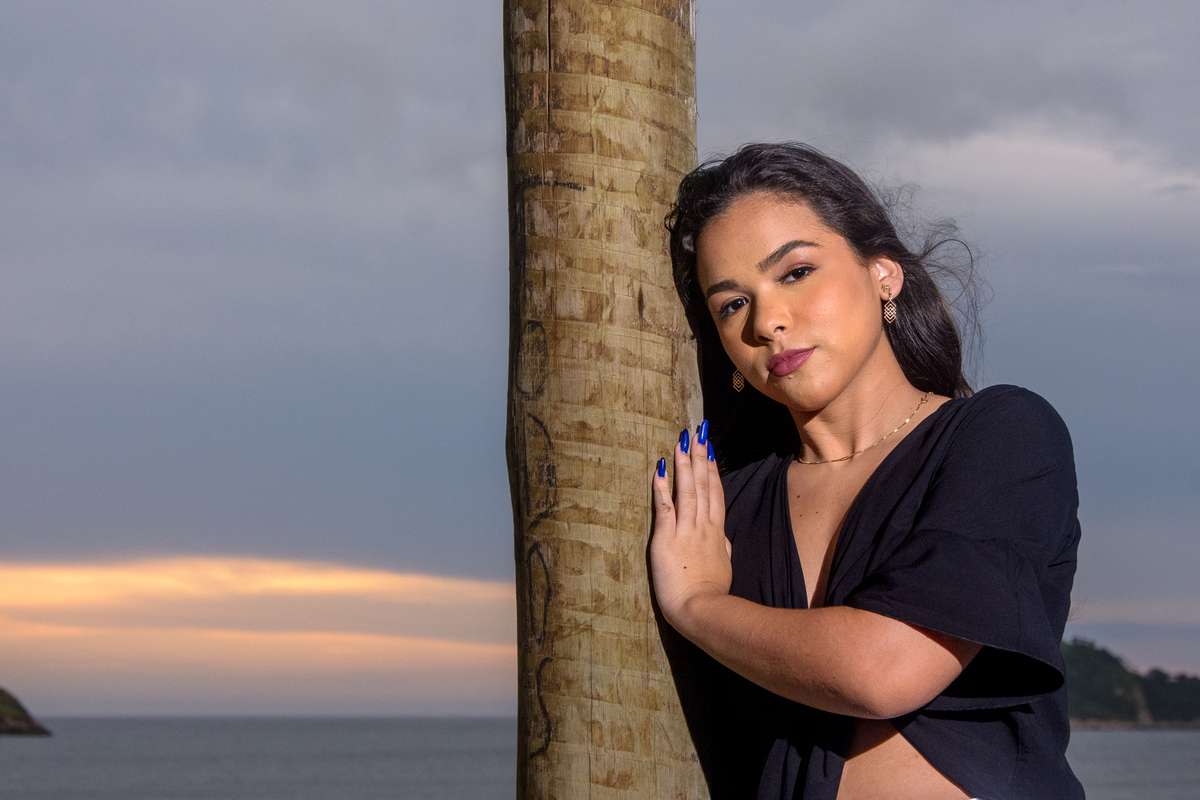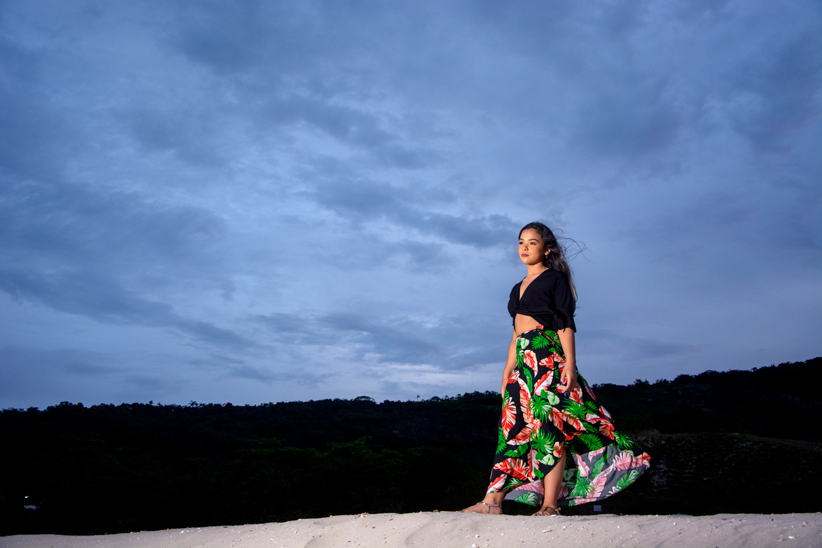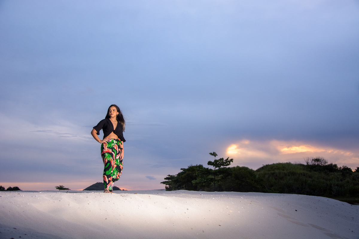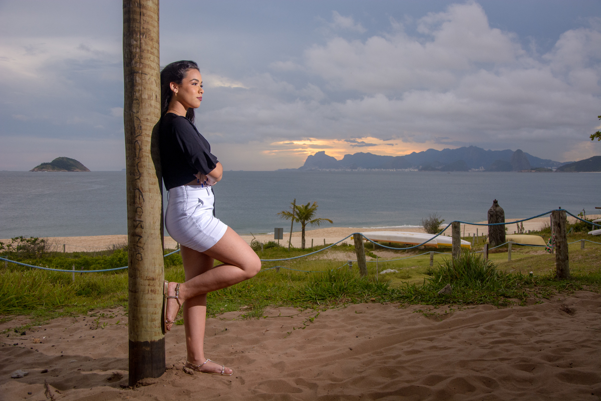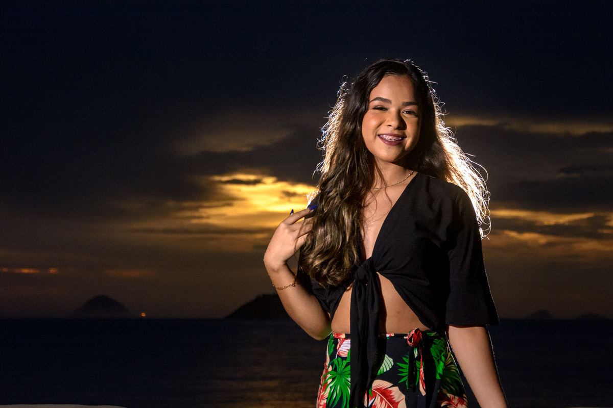 A debutante usou vestido azul e depois um top preto com short branco. Fotografamos também no canal de Itaipú e na praia de camboinhas. Buscávamos o por do sol mas infelizmente o dia não ajudou nessa parte. Pelo menos deu para fazer algumas fotos com alguns raios saindo por entre as nuvens, o que deu um clima bem interessante nessas fotografias.