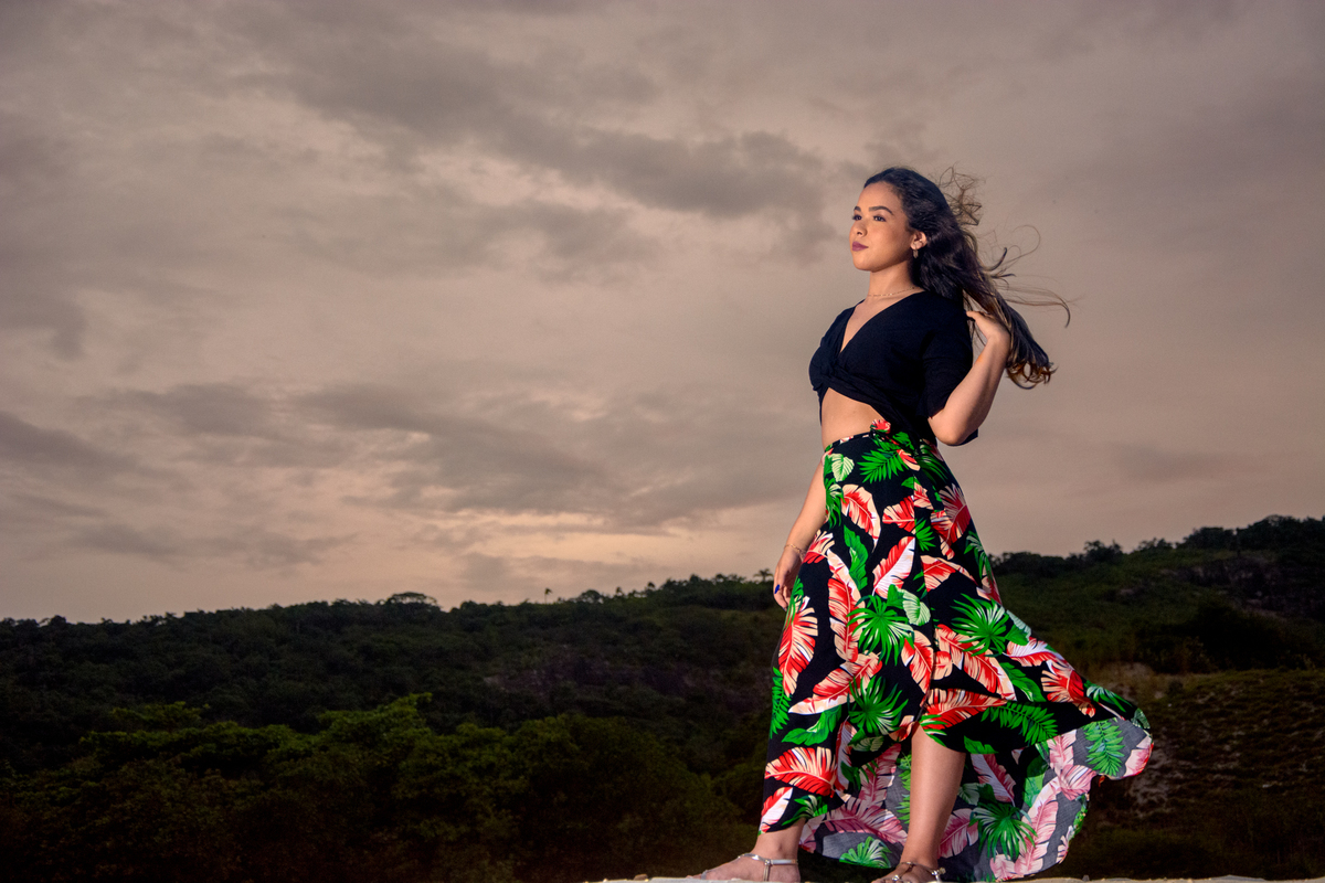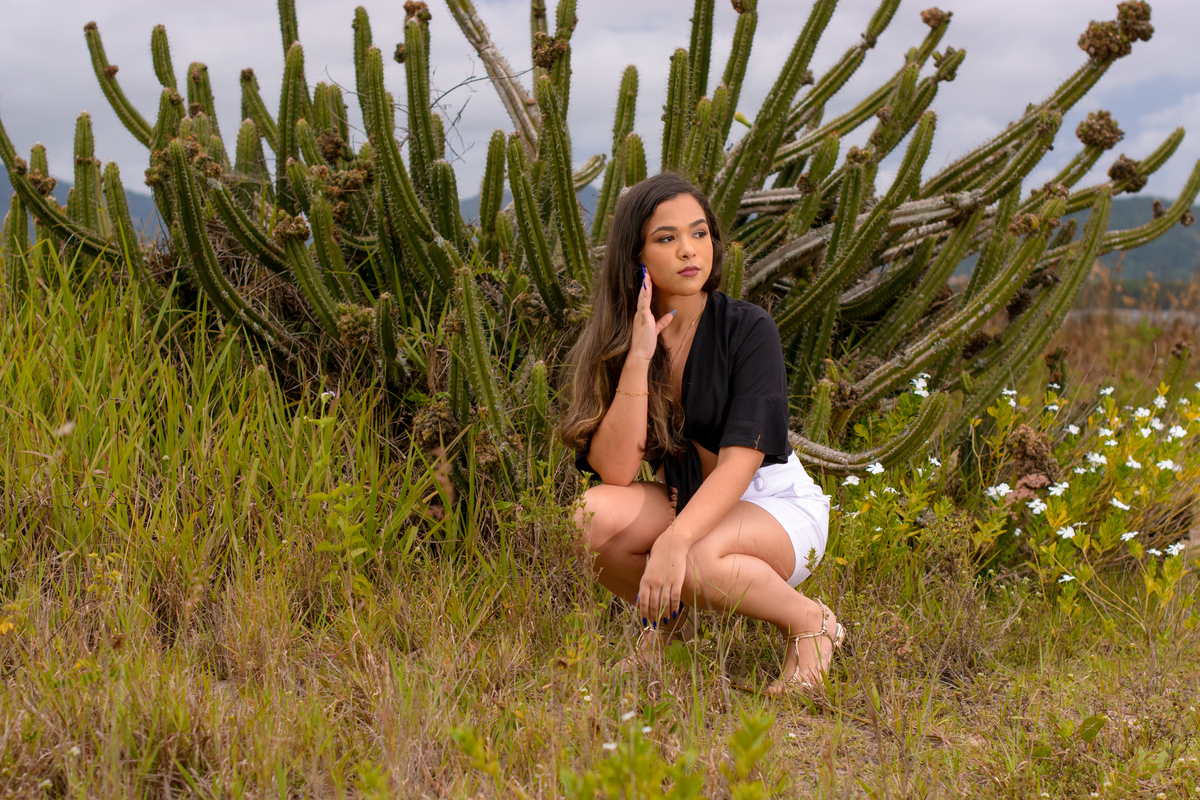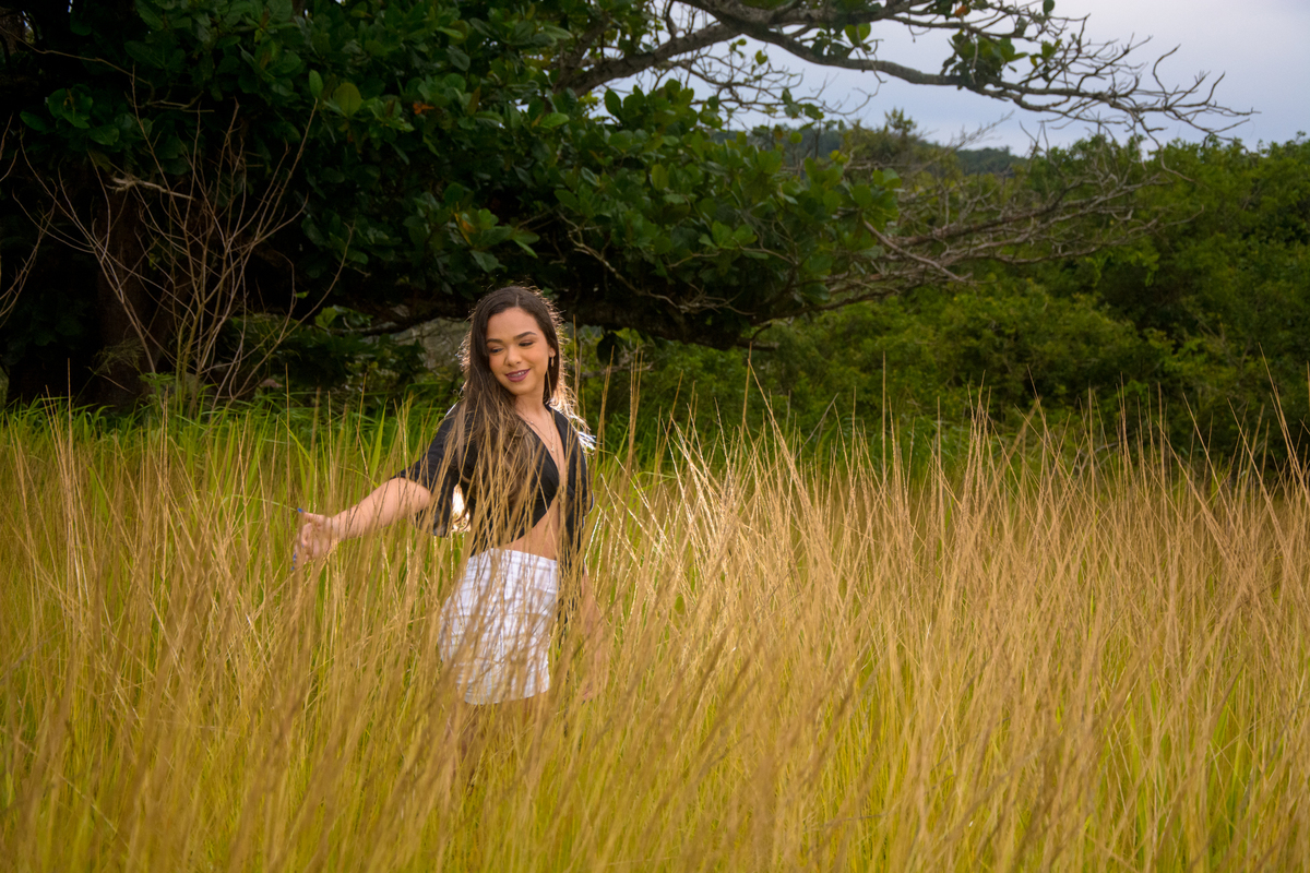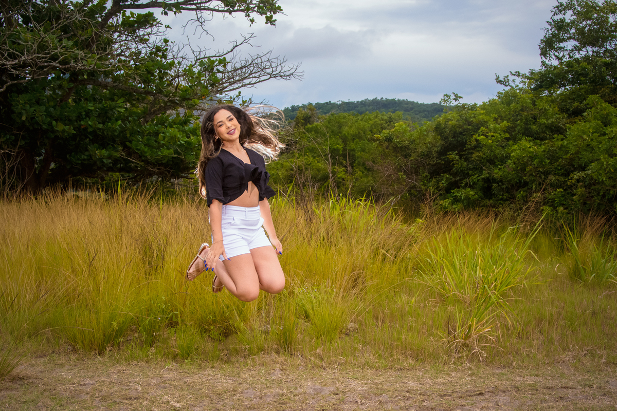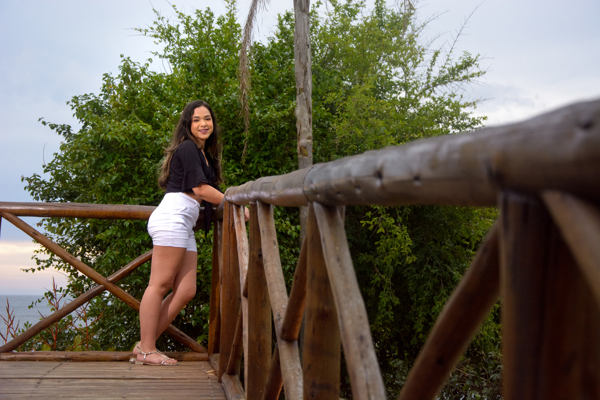 Iniciamos o ensaio no parque onde fizemos lindas fotos com uma ponte vermelha que cruzava um lago, exploramos a vegetação do parque que tinha cores que contrastavam com o vestido azul da debutante. Depois fomos até a praia de Camboinhas e exploramos cada canto de vegetação e natureza desse lindo local, como cactos, vegetação, árvores, areia e a própria praia para emoldurar a beleza da nossa debutante.