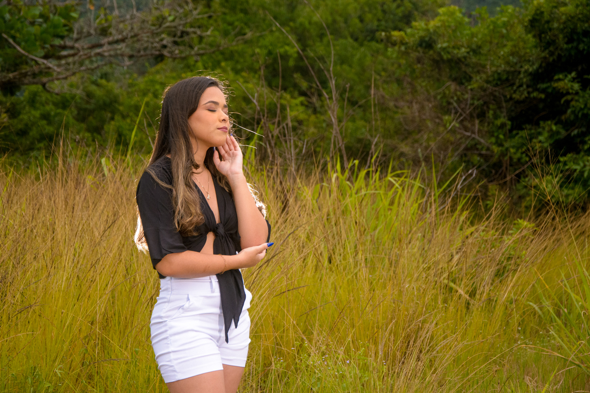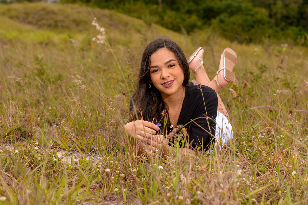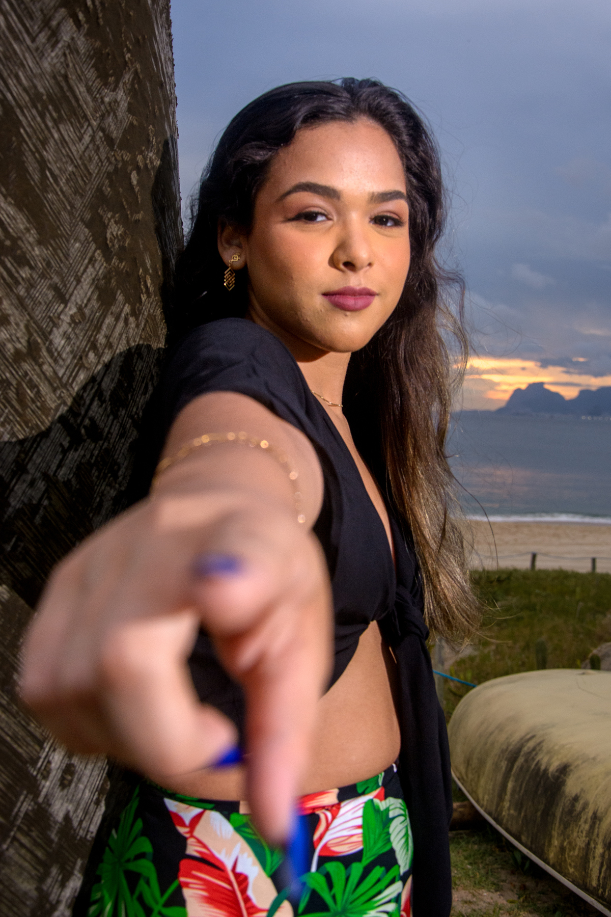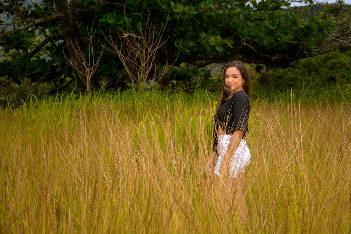 Iniciamos o ensaio no parque onde fizemos lindas fotos com uma ponte vermelha que cruzava um lago, exploramos a vegetação do parque que tinha cores que contrastavam com o vestido azul da debutante. Depois fomos até a praia de Camboinhas e exploramos cada canto de vegetação e natureza desse lindo local, como cactos, vegetação, árvores, areia e a própria praia para emoldurar a beleza da nossa debutante.