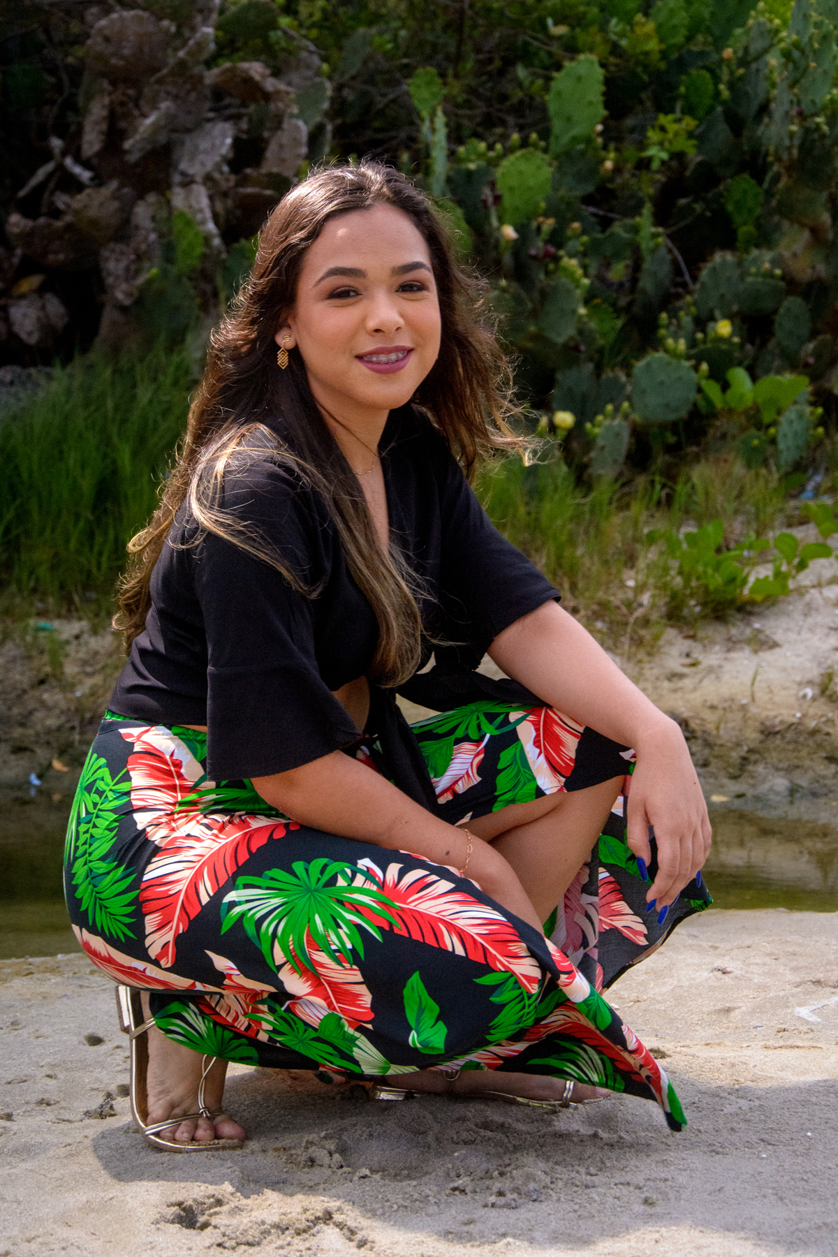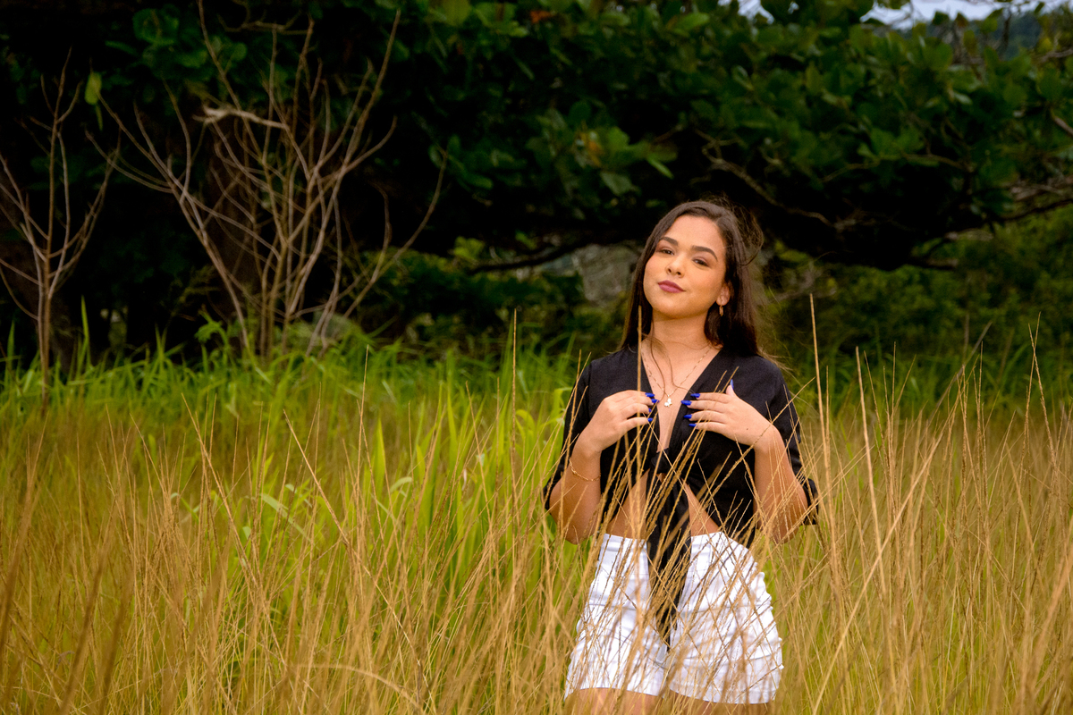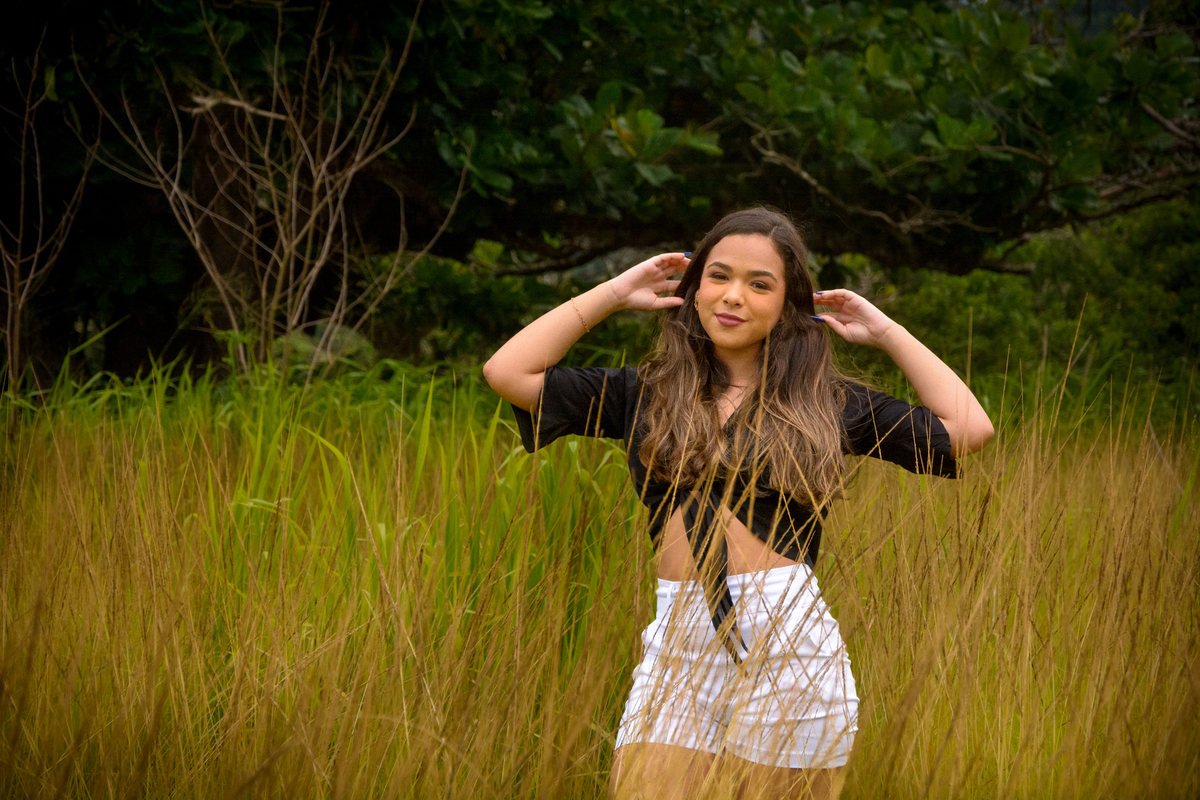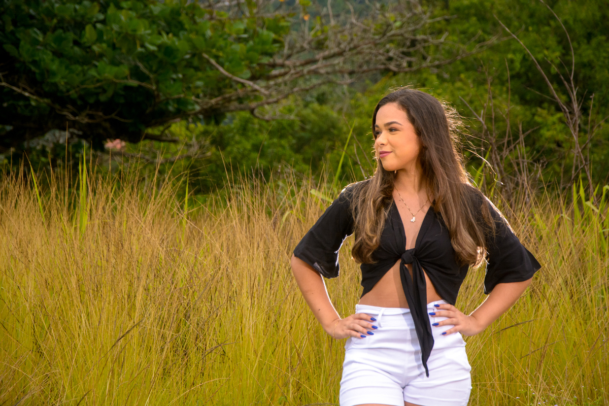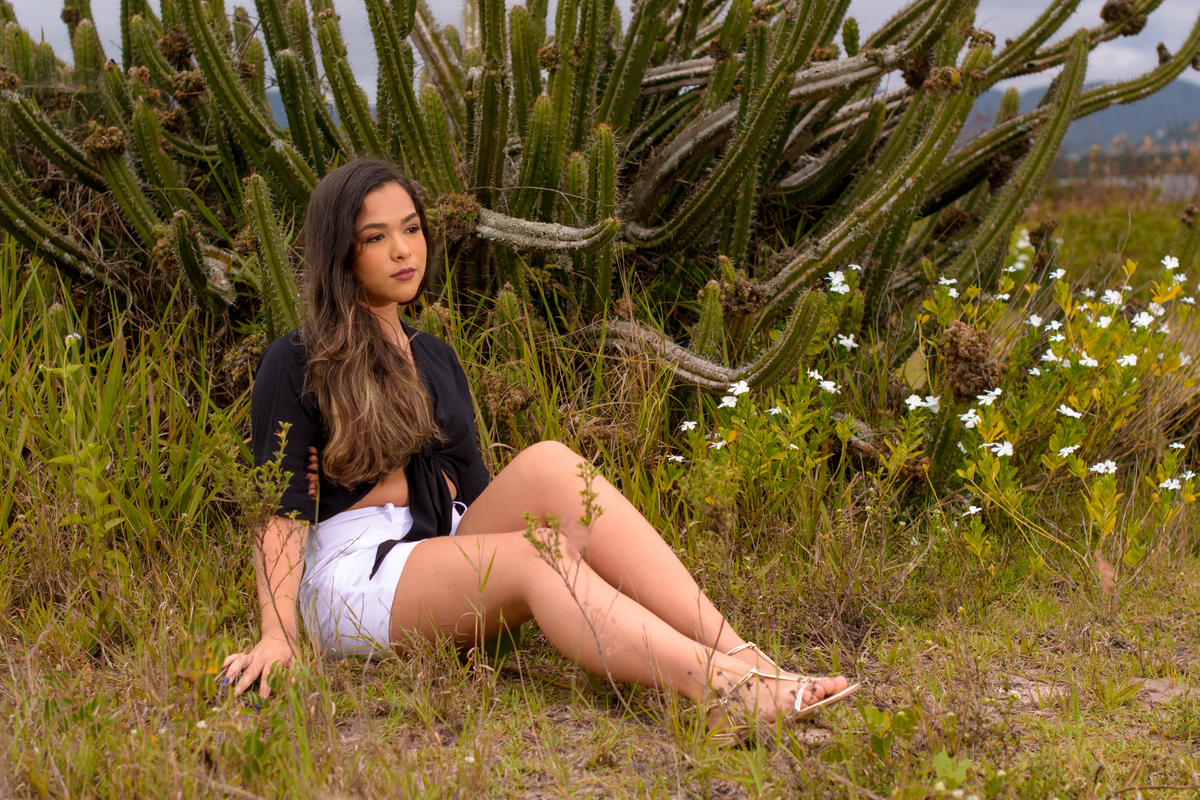 Iniciamos o ensaio no parque onde fizemos lindas fotos com uma ponte vermelha que cruzava um lago, exploramos a vegetação do parque que tinha cores que contrastavam com o vestido azul da debutante. Depois fomos até a praia de Camboinhas e exploramos cada canto de vegetação e natureza desse lindo local, como cactos, vegetação, árvores, areia e a própria praia para emoldurar a beleza da nossa debutante.